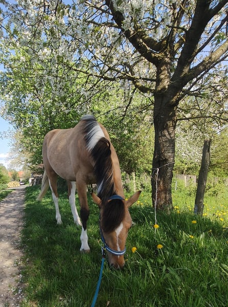 Young, very relaxed Buckskin Paint mare seeking caring, loving hands. She is familiar with ground work, simple tricks such as lying down, saddle, bitless bridle, and is fully prepared for starting under saddle. Mounting and dismounting she already handles very gently. During walks, she is curious and fearless. Friendly and human-oriented in handling, she knows trailer loading, is vaccinated, and regularly attends hoof care. She grew up robustly within a herd. Fala will become a wonderful, gentle riding horse and later, she will surely be suitable for families, children, and beginners. Initially, she needs an experienced rider or trainer. Her sire is the beautiful Grullo stallion EMH Paints PepsHonani. We wish for the little mare caring, loving hands to nurture her.