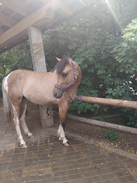 Junge, sehr entspannte Buckskin-Paint-Stute sucht fördernde, liebevolle Hände. Die Kleine kennt Bodenarbeit, kleine Tricks wie Hinlegen, Sattel, gebisslose Zäumung und ist komplett fürs Anreiten vorbereitet. Auf- und Absteigen macht sie schon ganz lieb. Bei Spaziergängen zeigt sie sich neugierig und unerschrocken. Im Umgang lieb und menschenbezogen, kennt Hänger fahren, ist geimpft und regelmäßig bei der Hufpflege. Robust im Herdenverband aufgewachsen. Fala wird mal ein super liebes Reitpferd und später sicher auch mal für Familien, Kinder, Anfänger interessant. Zuerst braucht sie noch einen erfahrenen Reiter/ Trainer. Vater: der wunderschöne Grullo- Hengst EMH Paints PepsHonani. Wir wünschen uns für die kleine Maus fördernde, liebevolle Hände.