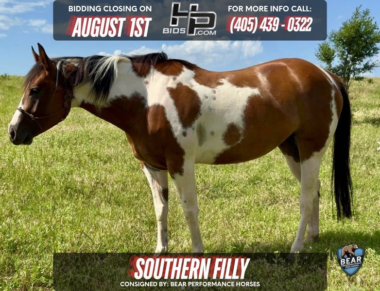 🔥MIDSUMMER CLASSIC 🔥 Happening NOW thru August 1st - Available EXCLUSIVELY on HP Bid’s website! For more details and to register visit: https://hpbids.com CONSIGNOR CONTACT: BEAR PERFORMANCE HORSES - (405) 439-0322 LOCATION: Kingfisher, OK BREED: APHA REGISTERED: Yes REGISTERED NAME: Southern Filly COLOR: Pinto HEIGHT: 15 AGE: 5 GENDER: Mare 🌸Southern Filly🌸 15 hands and Big Boned. Southern Filly is a beautiful, sweet, lovable mare with a good mind. She has been trained in a foundation for Reining/Ranch Riding that also works well for Dressage, Trail Classes, Working Cattle, or any similar guiding discipline. She has been trained to respond to a rider’s seat while on a loose rein, changing gaits or stopping based on seat cues. Southern Filly is push-style and not hot-blooded, so she is unlikely to run off with her rider. In addition to her extensive under-saddle training, Southern Filly has thorough groundwork experience. She responds to cues to move her forequarters, hindquarters, or whole body in a sidepass. She can be backed up—via lead rope pressure, nose pressure, or by wiggling the lead rope—and maneuvered while backing. She stands calmly for mounting from either side using a mounting block or fence rail, and is trained to wait for the rider’s cue to walk off. Outside the arena, Southern Filly continues to listen to the rider’s seat and cues. She can be ridden alone—away from the barn or other horses—without trying to hurry back home. She has been hauled off the property a few times and trail ridden with some exposure to light car traffic. Southern Filly has also been ridden throughout our pasture, wooded area, around farm equipment, and over obstacles like a bridge and tarp. She’s familiar with opening and closing gates, crossing water, and navigating hills, where she’s been taught not to rush. In addition, she has been used to push and gather cattle—something she really enjoys. Like many Paints, she has pink skin under her white patches that can sunburn during the high-UV summer months if left unmanaged. During peak UV hours, she does well when stalled in the shade. Southern Filly is a versatile mare with a lot to offer, whether you’re looking to participate in local shows or need a capable partner on the ranch! 🔹Registered in the Pinto Horse Association of America (PtHA) Color Registry (parentage unknown) 🔹15hands, Big Boned 🔹Good Minded, Not Mareish 🔹Push-Style 🔹Big Stopper, Can Stop Collected on a Loose Rein 🔹Goes from Trot to Lope from either a Squeeze of the Legs or Voice Command 🔹Walks, Trots, and Lopes on a Loose Rein Inside and Outside of the Arena 🔹Not just Loped in Circles, but has had Extensive Guiding Training to develop ‘Power Steering’ 🔹’Listens’ to the Riders Seat Inside and Outside of the Arena 🔹Transitions from Lope to Trot or Lope to Walk based on the rider’s Body Position While on a Loose Rein. 🔹Can Collect and Vertically Flex at the Walk, Trot and Lope. 🔹Sidepasses Under Saddle or Ground 🔹2-track at the Walk and Trot 🔹Trained in a Foundational Spin and Rollback 🔹Moves Forequarters off of the leg at the Standstill, Walk, Trot, and Lope 🔹Moves Hindquarters off of the leg at the Standstill, Walk, Trot, and Lope 🔹Backs, and can be Maneuvered while Backing Under Saddle or Ground 🔹Counter Canters 🔹Experience with crossing a bridge obstacle and going through water. 🔹Open/Closes Gates Under Saddle 🔹Taught not to rush Up or Down Hills 🔹Desensitized to a Rope (walk, trot, and lope), Plastic Bags, Stock Whip, Rain Coat, and Flag (Walk, Trot, and Lope) 🔹Not overly-Reactive to Spurs 🔹Enjoys working Cattle and is Cowy 🔹Stands Tied 🔹Hobble trained (Front and Sidelines) 🔹Stands for the Farrier 🔹Trailer Loads 🔹Easy to Catch 🔹Can be Bathed. For more information and questions about her please don’t hesitate to contact us! We have owned Southern Filly since she was a yearling and can tell you a lot about her.