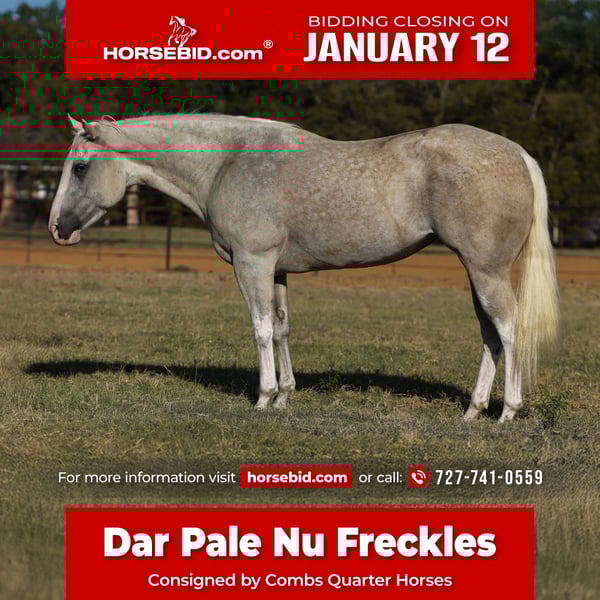 ♦️𝐍𝐄𝐖 𝐘𝐄𝐀𝐑'𝐒 𝑬𝒙𝒕𝒓𝒂𝒗𝒂𝒈𝒂𝒏𝒛𝒂♦️ Happening now thru MONDAY | JANUARY 12th - Available EXCLUSIVELY on HorseBid's website! For more details and to register visit: www.Horsebid.com CONSIGNOR CONTACT: Combs Quarter Horses 727-741-0559 LOCATION: Cleburne, TX BREED: APHA REGISTERED: Yes REGISTERED NAME: Dar Pale Nu Freckles Aka Lainey COLOR: Palomino overo HEIGHT: 15.1 AGE: 5 GENDER: Mare One of a kind, kid tested, mother approved APHA palomino paint mare! Dar Pale Nu Freckles (Ima Pale Face Cash x Dar FrecklesLaceyLynx) “Lainey” is a beautiful 5yr old 15.1h dappled palomino overo (sabino) mare with full APHA papers! Lainey is by the NRCHA money earning stallion Ima Pale Face Cash who is by the one and only 5 million dollar sire Pale Face Dunnit! Lainey is out of the APHA open point earning mare Dar FrecklesLaceyLynx who is by NRHA money earning stallion Doc Freckles! This young mare was no accident! She was bred and raised the right way! DISPOSITION: Lainey is a very loving, very kind, in your pocket kind of mare. She loves people and will stand for hours just to be brushed and loved on! This girl has a very “old soul” way about her and she’s one of the very few that have that “children’s horse” potential! She is currently being ridden by a youth and she has been ridden by smaller, less experienced children. She was absolutely flawless! Lainey is a little more whoa than go but very respectful and responsive to her riders cues. WESTERN EXPERIENCE: Lainey was started the right way! She has the handle of a Reiner without the speed. She knows all the leg, hand and seat cues but she is not overly sensitive to anything. She moves very well off of your leg with or without spurs. Lainey has all the training to walk right into a ranch riding or ranch trail class and be very competitive. You couldn’t ask for a better trail horse either! She will ride anywhere in the pack. She doesn’t get upset or excited even when the other horses leave her behind or run up behind her. Something that is very hard to come by. With her comfy jog and her very comfy short lope you will love taking this young lady out on those long trail rides! She’s not spooky or reactive to things you see on the trails or in the woods. Not bothered by traffic or wildlife either. Not even my rowdy dogs or terrorizing goat bother this sweet girl! ENGLISH EXPERIENCE: Lainey has such a cute little English trot and canter. She’s got a nice floaty way of going and she will pop right over the little jumps! UPKEEP: Lainey is currently eating a scoop of basic pellets twice a day and free choice alfalfa hay. No supplements or maintenance required to keep her sound. UTD on everything and wearing front shoes as a personal preference. We do have her in an aluminum wedges to enhance her beautiful flat kneed movement. Lainey has previously been barefoot without any issues at all. TURNOUT: Lainey is extremely laid back and easy going in the pasture. She can go out alone or in a group. You can turn her out with anything from the ponies to the drafts. GROUND MANNERS: Lainey has great ground manners. Respectful of your space and easily lead by adults or children. She’s great to saddle and bridle. Stands tied and crosstied. Loves bath time and grooming time. BAD HABITS/ VICES: Lainey has no bad habits or vices. No buck, rear, bolt, bite or kick. TACK: Lainey rides bareback, English or western. She will ride in anything from a halter and lead rope to a snaffle or twisted wire snaffle. She’s not a picky girl! Feel free to reach out with any additional questions at 727-741-0559 For references feel free to visit my personal group “Horses Amber Gourdon”