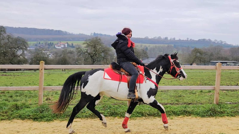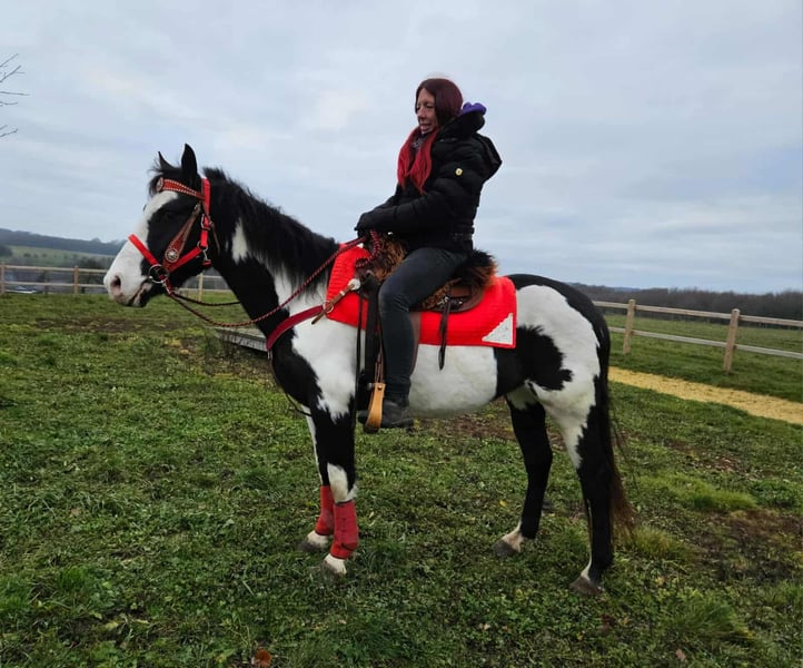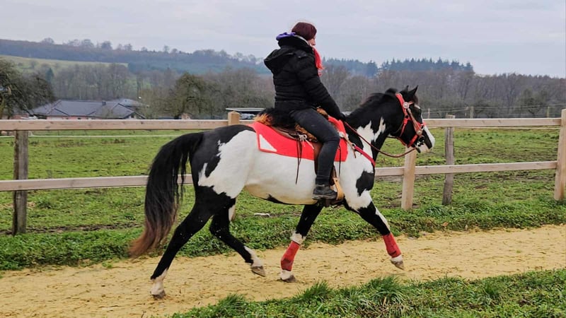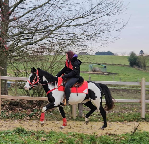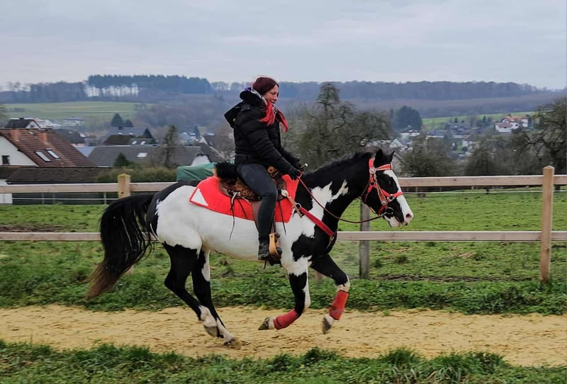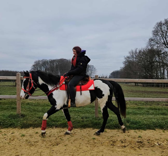 Paint Mare "Kaila" – gentle, calm, and versatile Age: 5.5 years Height: approximately 1.52 m (15.0 hh) Price: €7,600 Health certificate: available ✨ Description: This beautifully marked Paint mare impresses with her balanced temperament and friendly, pleasant demeanor. In daily handling, she is well-behaved, personable, and uncomplicated. Despite her young age, she presents herself as calm, relaxed, and resilient. Under saddle, she works cooperatively, eager to learn, and reliable. She enjoys working, is attentive, and provides a confident, relaxed riding experience. Especially suitable for leisure riding and Western disciplines, she is a versatile partner. 🐎 Perfect for: Riders seeking an uncomplicated, friendly, and dependable leisure partner. Thanks to her comfortable size, she is also well-suited for teenagers or smaller adults. Ideal for recreational riding, trail riding, and hacking. 🩺 Our horses are regularly: – dewormed – handled by a blacksmith – osteopathically checked 🛍 Farm shop: Western saddles, bridles, and accessories 🚛 Transport and equipment can be organized affordably upon request. Our services include: ✅ 3-month exchange guarantee ✅ Trial ride: €35, each additional horse €25 (credited on the day of purchase) ✅ €100 immediate discount for pickup/transport on the same day ✅ Personal and honest advice 📞 Please contact us exclusively by phone: 0171 – 4001968 🕗 Available daily from 8 am to 8 pm ⚠️ No emails or WhatsApp messages ⚠️ All information provided without guarantee