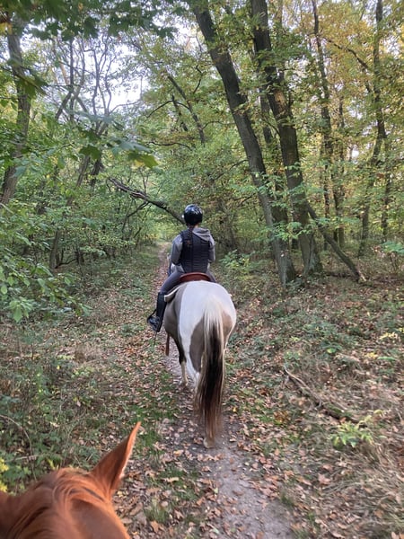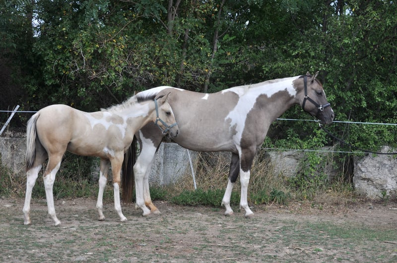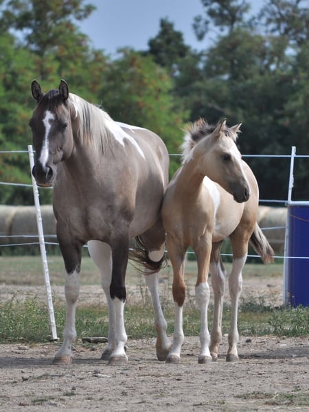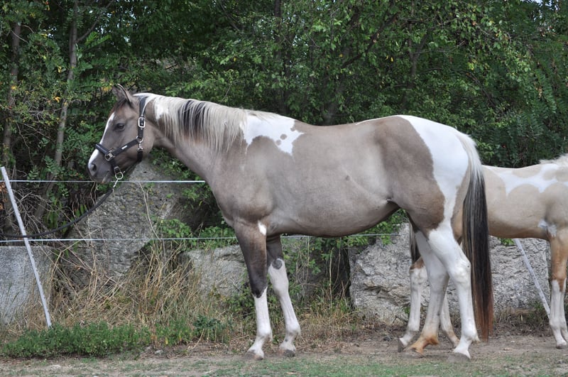 American paint horse mare born in 2019 - pregnant, sire of foal: Playboy Bugs Bunny, 7 panel n/n (due date 31.5.2026, last year's colt from the same connection can be seen with us) - has US certificate, horse passport and 7 panel test (is gbed carrier, all other has n/n including myhm/imm) - trained by a professional (Ondřej Houška, Ranch Oswego), started before her fourth year, then ridden by an experienced rider on trail rides, now is not being ridden due to her pregnancy - she is used to cars, trains, motorbikes etc., she doesnt spook, is rather active than lazy - great with all handling, veterinarians and farriers, is non-conflict in the herd, respects electric fence, is vaccinated, dewormed, trimmed and has teeth done regularly - is in good condition and well-fed - has no problem with transport, stands tied, leaves other horses, respects people, in short she is well-mannered - mare has an excellent pedigree (in pedigree RW Rocket Ranger, Josies Amigo Sunray, Spookernatural, Blue Eye Jane Valley, Emphasis), is suitable for breeding and is a good mother - strong, beautifully built mare, about 160 cm tall, a typical representative of the paint horse breed - she has rare color smoky grulla tobiano (carries both dun gene and cream gene) and is homozygous tobiano - she will always have spotted foal, even with a solid-colored stallion - located in Znojmo, Czech Republic