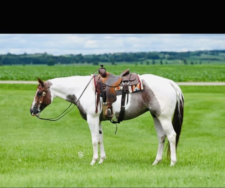 SUBASTA EN LÍNEA Haz tus ofertas en www.PlatinumEquineAuction.com Oferta inicial $3,500 La subasta termina el 12 de octubre de 2025 ¿Necesitas una silla nueva? Visita White Rock Saddles en nuestra página web o en Facebook Presentamos a esta hermosa y versátil yegua de rancho o WP, a la que llamamos Trouble. Mide aproximadamente 1.55 m (15.2 manos). Tiene la presencia para captar miradas, además de la personalidad y clase que buscas. Su pasatiempo favorito es hacer burbujas en el agua o coger el peine de casco y jugar con él. Tiene mucha personalidad. **2018 ~ tobiano rojo roano (APHA/PtHA) Padre: Rockin Vital Signs Madre: Executive Trouble por Fancy Bonanza Ganadora de $ en Futurity de Paint en 2019 - en línea de trabajo En 2021, estuvo entre los 10 mejores en la exposición de color del Congreso en pinto; la yegua más joven en WP en paso/trote, quedó entre las 5 mejores de 35 caballos. Desde entonces, ha participado en exhibiciones y ha obtenido buenos resultados en shows divertidos. Trouble se desplaza con gracia y tiene un carácter que la hace apta para toda la familia. Es una favorita en el establo y siempre alegra el día. Quiere ser una yegua tranquila y fácil de manejar. Fácil de cargar. Llévala en rutas de senderismo si eso es lo tuyo. Es excelente para el herrador, veterinario, cuidado, etc. Puede montar sola dentro o fuera de la pista. Es una yegua de fácil cuidado. Lleva a esta yegua a competir en WP paso/trote y gana, o déjala en el estilo ranchero, que es la dirección en la que hemos trabajado con ella. Ha sido transportada, utilizada en clínicas de ranch, cruzará puentes, hará giros y pasará de lado. ***Ideal para jóvenes experimentados, novatos o amateurs en WP o ranch. Aunque puede reducir el paso para WP paso/trote, prefiere el trote de ranch. Ha estado en entrenamiento de ranch durante 6 meses. Hermosa y de movimiento suave, ¡llama la atención! La única razón por la que esta dulce yegua está disponible son asuntos personales (divorcio). Aprovecha esta oportunidad de adquirir a esta yegua especial. Es llamativa, dulce y hermosa. **Radiografías limpias de pies, patas y espalda disponibles bajo solicitud. También tengo videos adicionales de senderismo y de ella montada en la pista en casa, si los necesitas. Contacta con Lisa – los mensajes de texto son más rápidos, pero intentaré responder a las llamadas lo antes posible al 843-450-1383. SUBASTA EN LÍNEA Haz tus ofertas en www.PlatinumEquineAuction.com Oferta inicial $3,500 La subasta termina el 12 de octubre de 2025 ¿Necesitas una silla nueva? Visita White Rock Saddles en nuestra página web o en Facebook