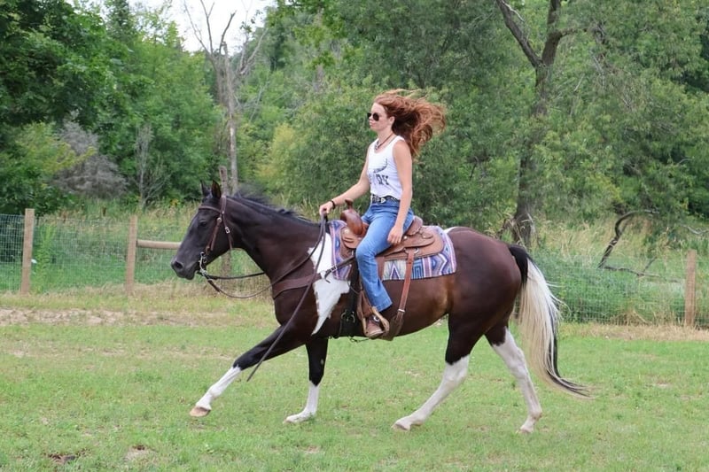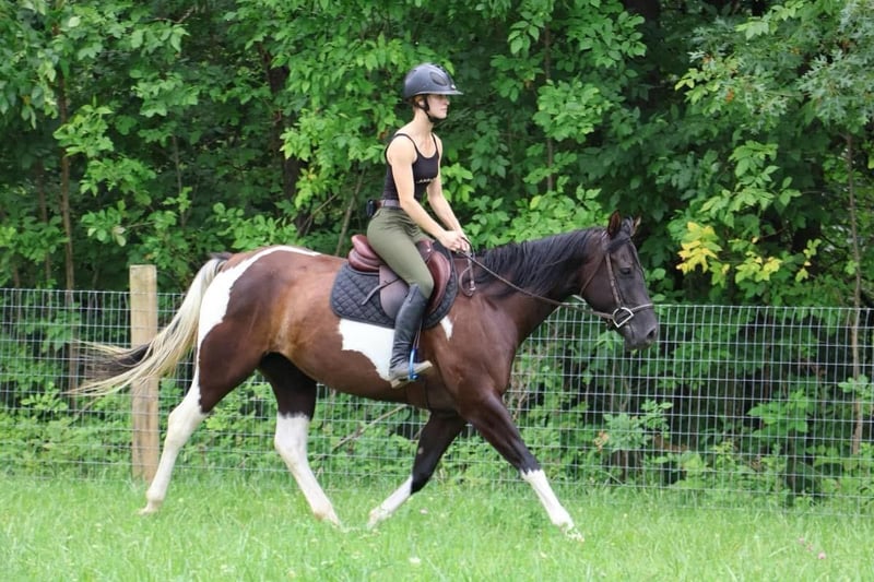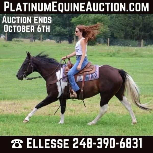 ONLINE AUCTION Place your bids at www.PlatinumEquineAuction.com Starting Bid $3500 Auction ends October 6th, 2024 Need a new saddle? Check out White Rock Saddles on our website or Facebook! Oreo is the go to horse for any timid, first time rider who just wants to sit back and relax. She is a beautiful black and white paint mare. She is 7 years old and stands 15hh. Oreo is a reliable horse who carries herself with style and grace. She is very well broke at all of the gaits and effortlessly picks up both canter leads and she also comes with excellent breaks. Oreo has a lovely one handed neck rein and strives to please her rider. She has been extensively trail ridden, road ridden and has been camping. Loud traffic, deep water, bridges, deer and bicyclists are no issue for her. Oreo is a seasoned trail horse who will ride out alone, lead a group or happily follow behind. If there’s one thing this girl knows, it’s how to take good care of her rider. Oreo has also been to local shows and has carried the flag in a few parades! She has been a camp favorite to all of or beginner riders and now she’s looking for a person to call her own. If you’re looking for a safe, quiet horse to enjoy out on the trails, Oreo will make an excellent addition to your family. To come meet this delightful girl please give us a call or text. Located in Howell Michigan Contact Ellesse Schwartz 248-390-6831. ONLINE AUCTION Place your bids at www.PlatinumEquineAuction.com Starting Bid $3500 Auction ends October 6th, 2024 Need a new saddle? Check out White Rock Saddles on our website or Facebook!