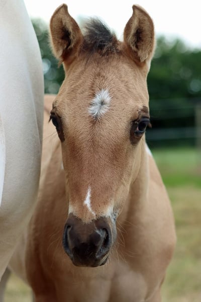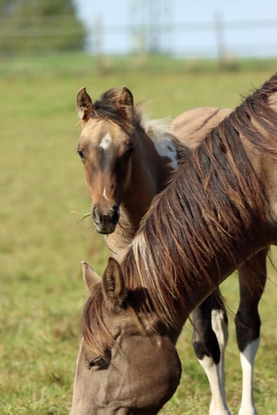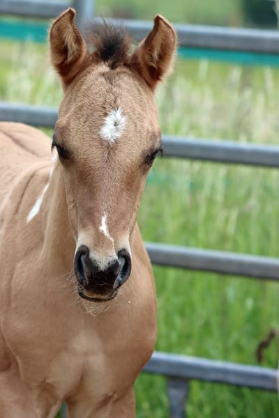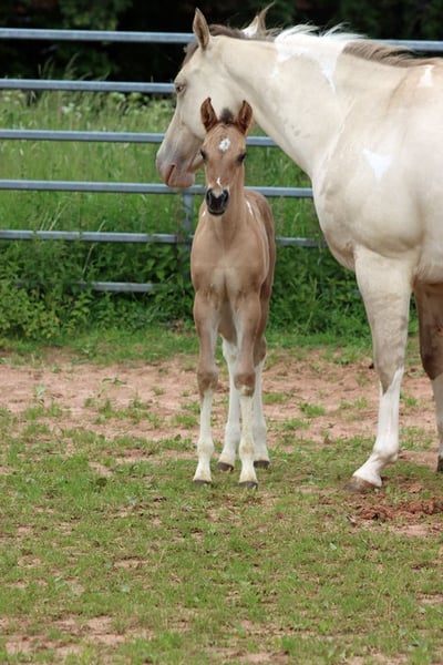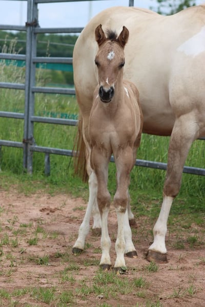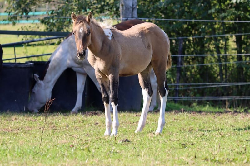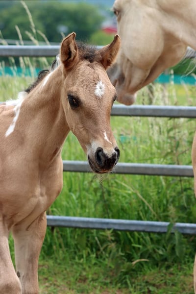 CHEYENNES VQ KAHLUA Bay Dun Tobiano APHA Stute. (Homozygot Tobiano und Black) Geboren: 25.05.2025 Engrösse ca 153 cm 7 Panel N/N EE Aa Dd TT