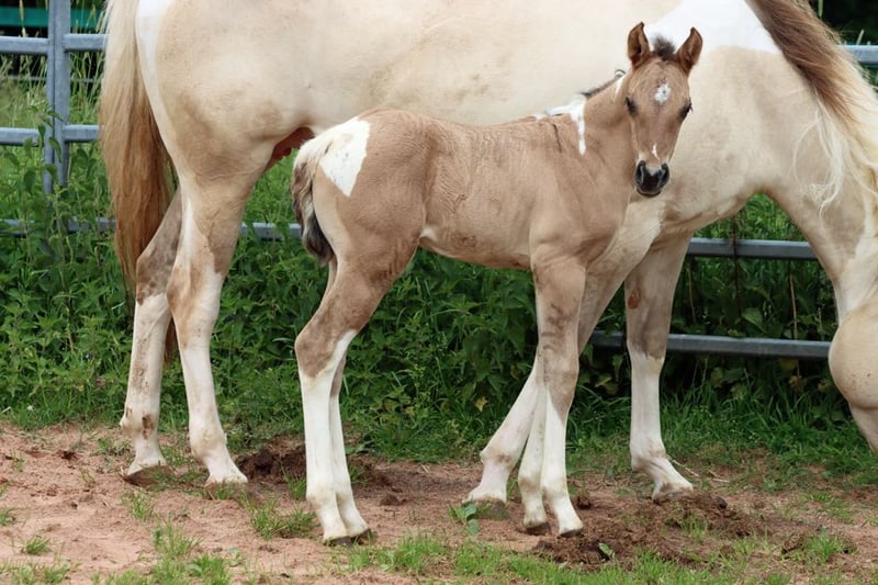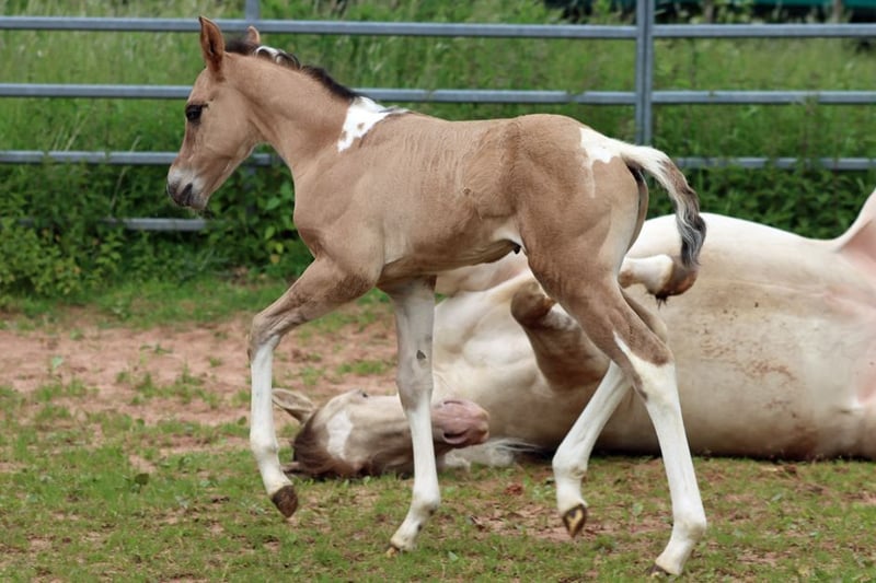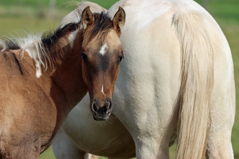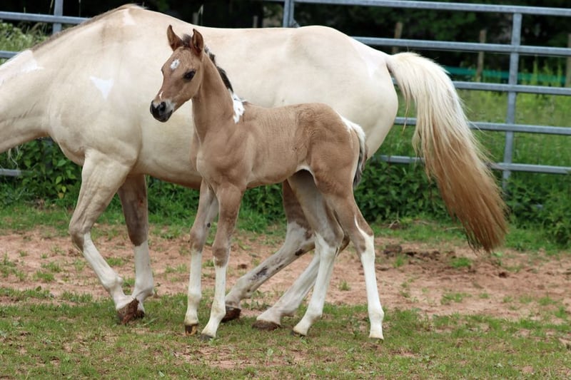 CHEYENNES VQ KAHLUA Gniada kasztanowata tobiano APHA. (Homozygot tobiano i czarny) Urodzona: 25.05.2025 Wzrost około 153 cm 7 panel N/N EE Aa Dd TT