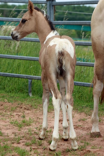 CHEYENNES VQ KAHLUA Bay dun Tobiano APHA mare (homozygous Tobiano and black). Born: May 25, 2025 Approximate height: 15.3 hh 7-panel N/N EE Aa Dd TT