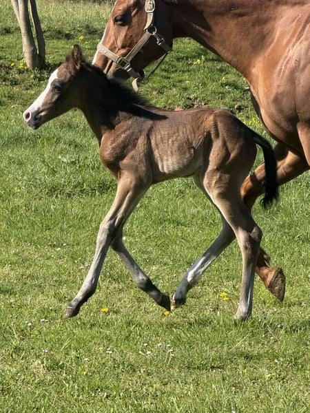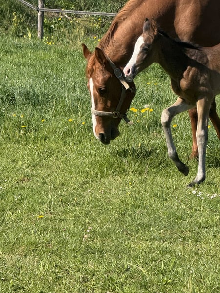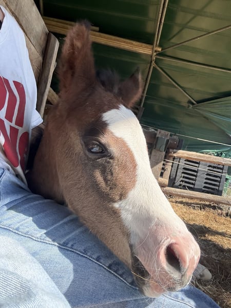 🇫🇷 Phc Candy OriginalAssets Stunning Paint Horse filly born on April 14, 2026. Solid bay/sabino? Excellent all-around performance bloodlines Sire: APHA/AQHA Classic Cowboyspirit, son of Original Cowboy (Lazy Loper) and Plentyofgoodnclassic (Clayboy) Dam: APHA Sensamazing Pink Lady, daughter of Amazing Hot N Rich (Invitation Only) and Sensational Pinkasset (Sacred Assets - Rosie Sensation) She already stands out with her elegance and adorable temperament ❤️ Estimated height: approximately 1.55 m (16.1 hh) Located in France near Lyon