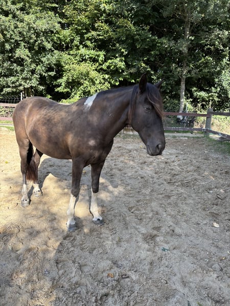 Cheval de cœur Tony cherche son foyer pour toujours Parfois, la vie nous mène dans des directions que nous ne souhaitons pas. C'est pourquoi nous cherchons pour notre Tony un foyer aimant et permanent où il pourra rester. Fiche d'identité • Nom : Tony • Âge : 10 ans • Taille : environ 1,53 m • Prix : à débattre 8.000 € — priorité à la place, c'est certain Caractère & comportement Tony est un véritable charmeur : très délicat à la main, attentif et toujours désireux de plaire. Il fait très attention à son humain, n'a pas de vices et n'a jamais montré de comportement malveillant. En interaction, il est un partenaire sensible et affectueux, qui fait confiance et aime apprendre. Utilisation & compétences Tony est vendu comme cheval de loisir. Il est très délicat au sol et monté, écoute bien et apprend rapidement. Lors des sorties en extérieur, il est absolument fiable – une véritable assurance vie en terrain. Il connaît également les petits sauts et le longe. ❗ Important : Tony n'est pas un cheval de poids, nous souhaitons donc un cavalier qui saura apprécier ce cheval délicat. Hébergement Tony est actuellement dans un paddock avec accès à l'herbe 24/7 ; en hiver, il rentre dans l'écurie la nuit – c'est exactement ce type d'hébergement que nous souhaitons pour son nouveau foyer. Il est sociable, compatible et se sent bien en compagnie d'autres chevaux. Actuellement situé à Langenfeld. Raison de la vente Tony est vendu pour des raisons de santé de son propriétaire. Il ne s'agit pas de problèmes de comportement, mais d'une situation de vie triste qui nécessite une nouvelle placement. Plus de détails lors d'une rencontre personnelle. Informations importantes & conditions • Essai possible sur rendez-vous (frais de 25 €, remboursés en cas d'achat) • Place avant prix – Tony doit aller dans de bonnes mains • Base de négociation : 8.000 € à débattre