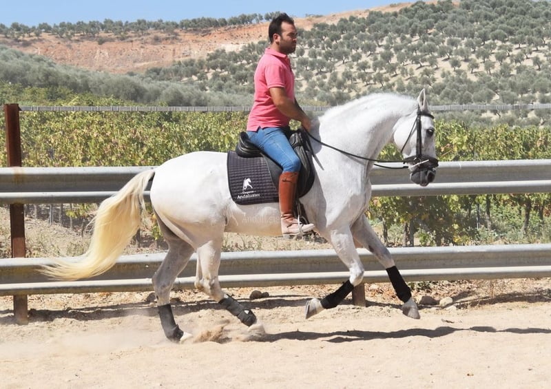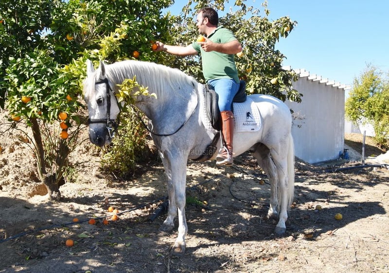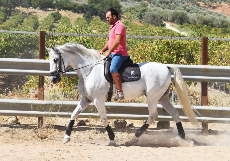 lieber Charakter, in den Grundgangarten geritten, hauptsächlich Gelände, Feria, Romería, Rocío, für schwächere Reiter geeignet www.elegante-andalusier.com