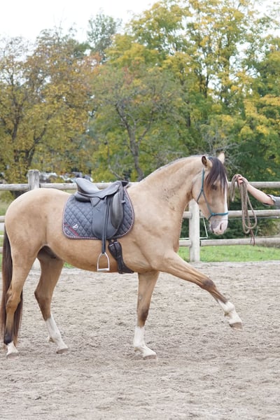 Rafalin wird im Frühjahr 4 Jahre alt. Dieser schicke Falbe ist ein wahrer Herzensbrecher und ein Freund fürs Leben. Sanftmütig, menschenbezogen, absolut charmant und liebenswert. Er zeigt sich völlig unklompliziert in der Ausbildung, er wurde mit viel Zeit vom Boden aus ausgebildet kennt die Freiarbeit und hatte schon einige Geländeritte am langen Zügel. Er geht problemlos voraus, geht auch schon durchs Wasser. Im Gelände ist er unerschrocken und wirklich sehr trittsicher. Er wurde sehr schonend, gebisslos angeritten; zeigt sich während des Beritts völlig unkompliziert. Er ist absolut gesund, hat tolle Hufe. Vor ca. 1,5 Jahren wurde eine AKu mit 14 Röntgenaufnahmen gemacht – alles unauffällig. Absolut herdenverträglich und Offenstallhaltung gewöhnt. Aktuell läuft er barhuf, kommt gut damit zurecht. Er kennt Horsemanship und lässt sich problemlos verladen. Für Rafalin wünschen wir uns einen erfahrenen, kompetenten Pferdemenschen mit viel Herz und dem nötigem Budget, ihm einen schönen Platz in Herdenhaltung bieten zu können. Weitere Infos auf Anfrage.
