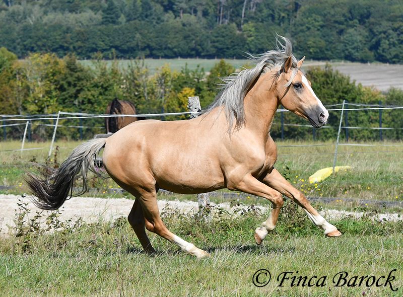Breed: Andalusian Name: Lamborgini Gender: Gelding Height: 146 cm Age: 14.04.2020 Color: Palomino Price: €7700 Father: n/a Mother: n/a Lamborgini, a little guy in a stylish jacket with a friendly character! With his silver mane, he is an absolute rarity! Despite his size, he covers ground very well and is still fully in development. He will definitely continue to grow. Lambo is solidly trained in the basic gaits. The focus has clearly been on trail riding for him. He has experienced more of the world outside than in the arena. He loves trail riding, shows little concern for the environment, and goes out alone as well. In the arena, we are currently refining the basics; he learns something new in every session. Even with less experienced riders, he shows himself to be exceptionally well-behaved and polite. He wants to please and tries to respond to new aids for him. A fantastic boy for the smaller rider who is looking for a horse that enjoys trail riding but is also motivated in the arena. Lamborgini has already undergone a clinical examination (without abnormalities) and X-rays. As he has a finding (cartilage chip), he is being offered at a significantly lower price. Contact: Finca Barock, Tel. 0173-696 31 81, 56291 Wiebelsheim