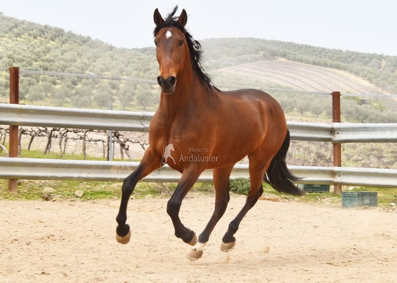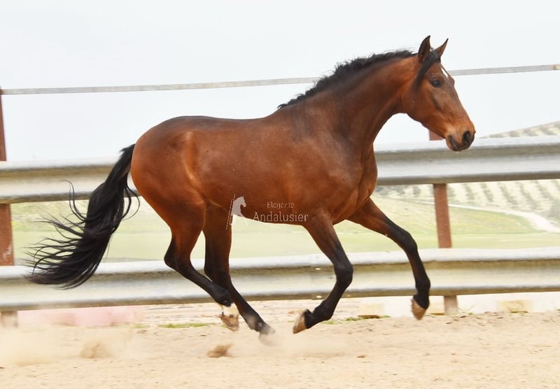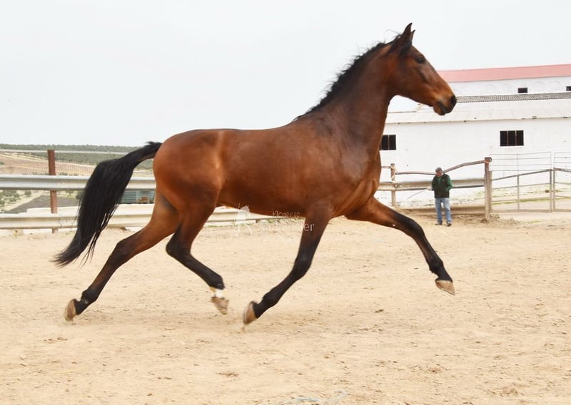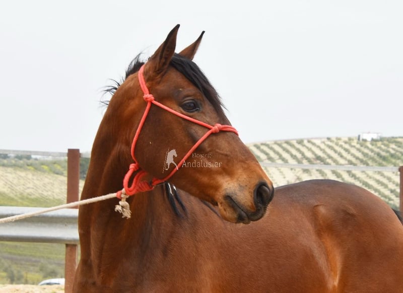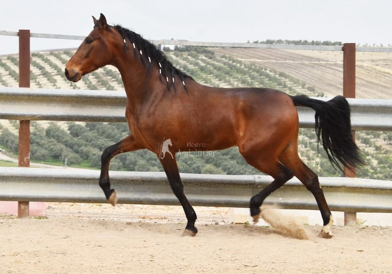 Hermoso caballo andaluz de color marrón, potro de familia
