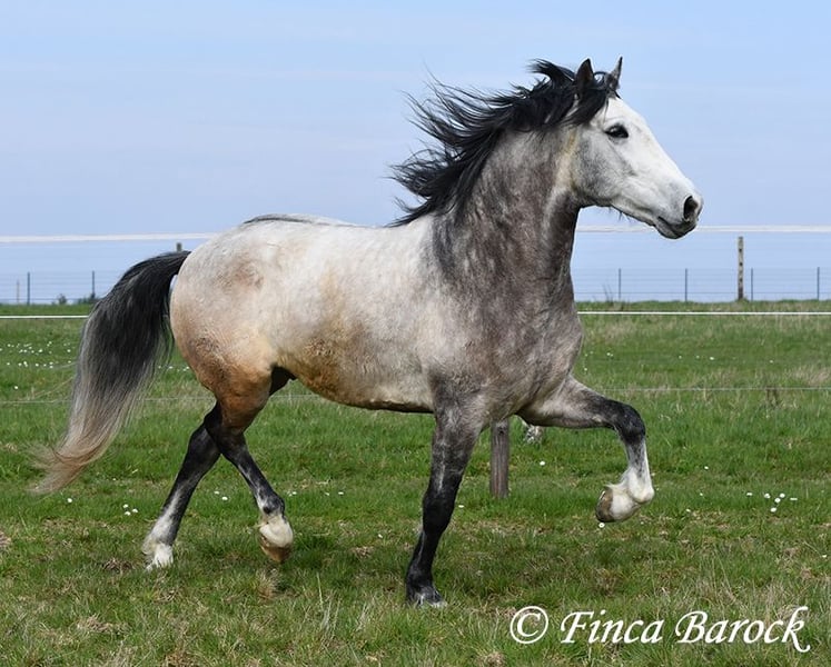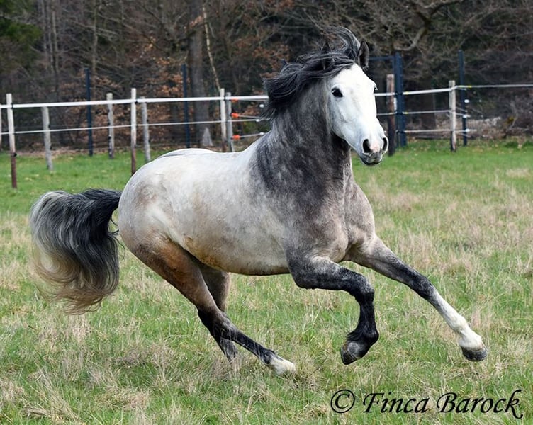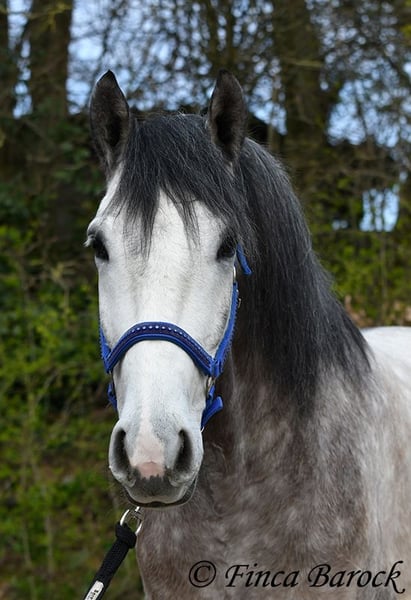 Breed: Andalusian Name: Bambino Gender: Gelding Height: 1.60 m Date of Birth: December 12, 2020 Color: Grey (Dapple Grey) Price: €12,500 Sire: Unknown Dam: Unknown Bambino is an absolute sweetheart and quickly wins everyone over with his friendly nature. He has been ridden in the dressage arena and is more experienced in trail riding than in work within the ring. Trail riding is his absolute specialty. He is comfortable going alone or in a group, often leading confidently but remaining relaxed at the back as well. In the arena, he is currently learning the basics. He responds well and wants to please his rider. He has a lovely uphill canter and comfortable movements. Overall, Bambino is more the type to motivate rather than to be difficult. He is by no means lazy! The clearer the rider’s aids, the easier he is to move forward. Bambino is playful and enjoys everything that can be used for fun—whether it’s a blanket in front of the box or grooming tools within reach, he finds everything interesting to play with. He remains polite with people at all times. He is of sturdy build and provides good coverage for the rider. With him, you get a playful boy with comfortable movements and a friendly character who is eager to grow further with his rider. Includes clinical examination and X-rays. Contact: Finca Barock, Tel. 0173-696 31 81, 56291 Wiebelsheim