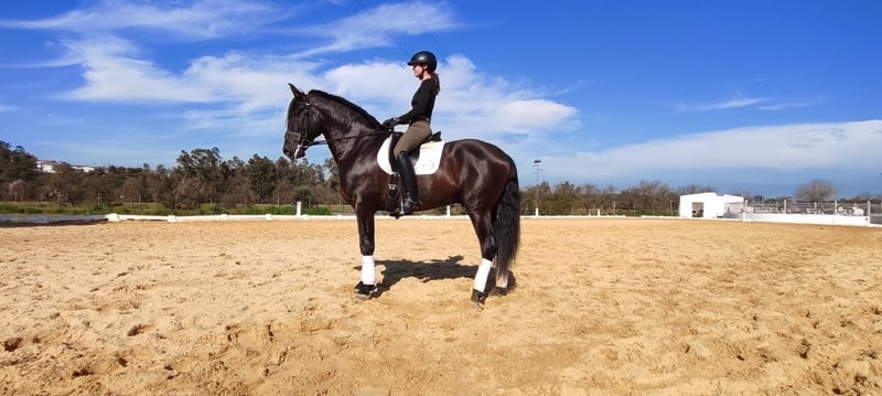 Lovely 16.3hh 5 year old PRE purebred stallion. Has a super temperament, a very kind eye, easy to do anything with. Has 3 established paces on the flatwork and is now training to go up the levels, he is very willing. Will make a lovely dressage prospect. Has no stallion behaviour, is used to being in a yard woth other horses and in the arena woth other horses. Everything available to view and try if you can travel to the yard. Potential buyers need to WhatsApp us a video of their riding ability through to 00353879297498 a nd we can assess suitability. Located in Spain. Worldwide shipping available please contact us for a quote.