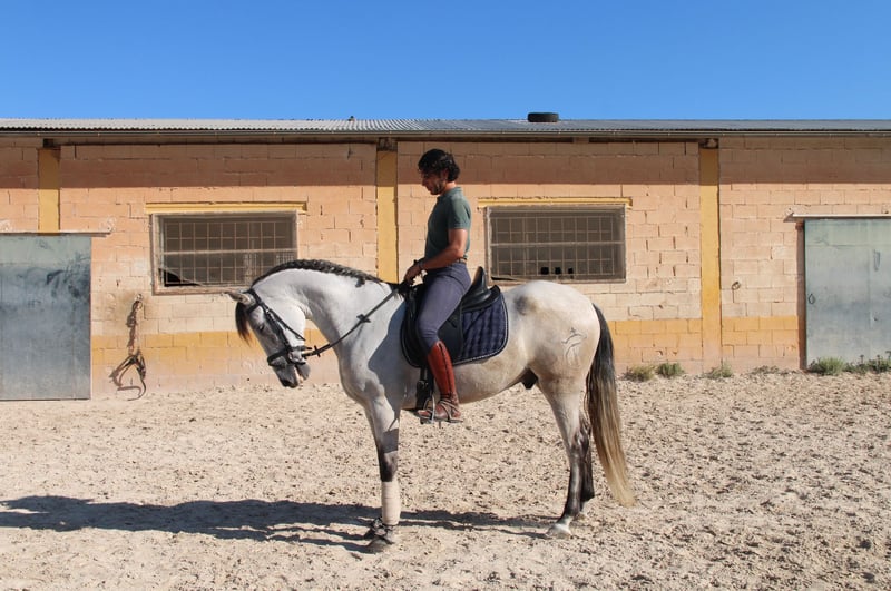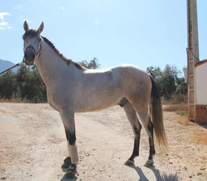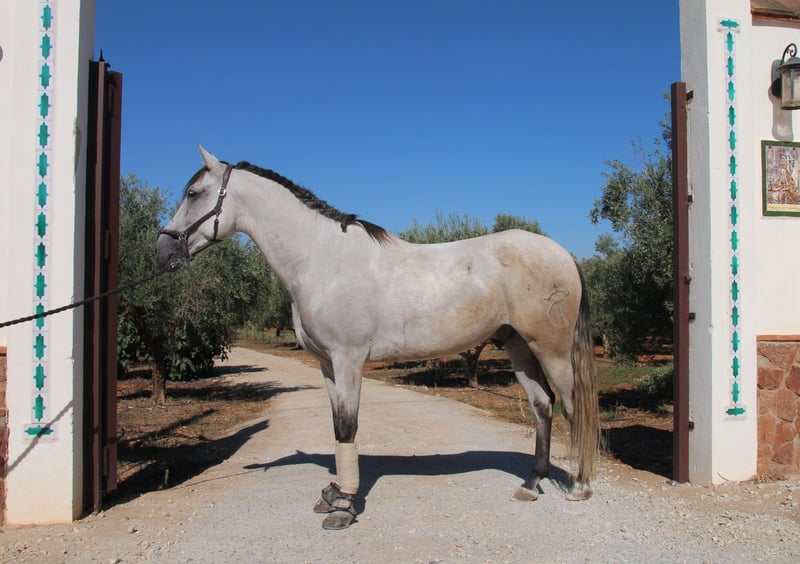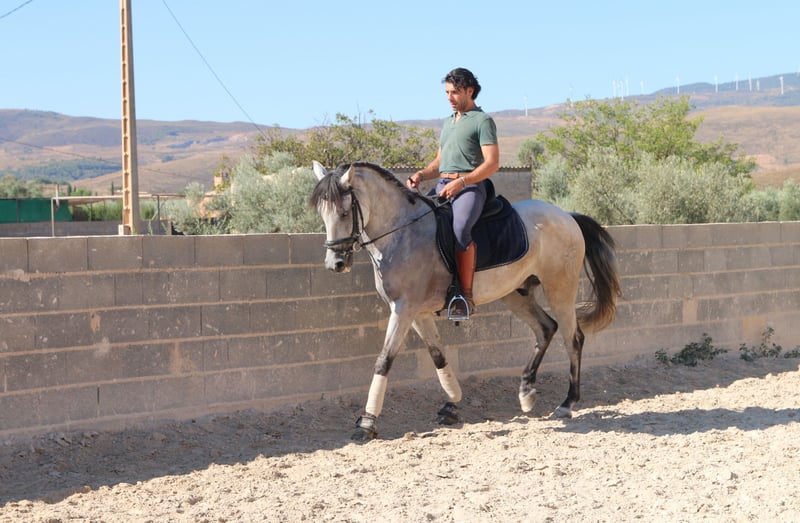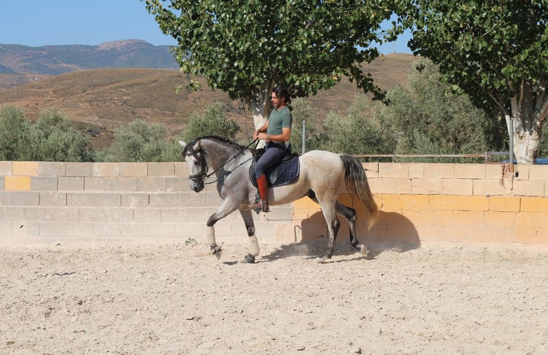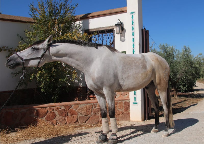 Chaleco is my charming Andalusian gelding, whom I purchased here three years ago. From the very first moment I met him, he enchanted me with his big heart and tireless curiosity. VIDEOS: Dressage: https://youtu.be/Lqp8J4i6DH4 Cross-country: https://youtu.be/0KeWjlmVudg Liberty/Free Dressage: https://youtu.be/A0-vZjVFF8M Chaleco’s natural curiosity and strong willingness to work are reflected in his dressage training. He is extremely eager to learn and always wants to be challenged. With his very sensitive mouth, he responds beautifully to light aids and has mastered the following exercises: Basic gaits (walk, trot, canter) Shoulder-in (walk, trot, canter) Shoulder-out (walk, trot, canter) Leg-yield (walk, trot, canter) Transitions walk > canter Transitions full halt > walk/trot/canter (and vice versa) Rein back Flying changes in canter Free jumping up to 1.20 m Jumping under saddle up to 1.00 m His movements are impressively elegant, he is very comfortable to sit, reacts to the finest aids, and combines strength with great motivation to work. Chaleco brings excellent quality that, with the right rider, makes him a very promising dressage horse. Currently, Chaleco has a 15-year-old part-lease rider who is just beginning to introduce him to jumping. He also hacks out alone, but only with experienced riders he feels safe with. Chaleco loves being around people and other horses and needs his daily share of cuddles. Especially in liberty dressage he shows himself to be a true natural talent. He not only masters free circling at walk and trot, but also recall training and waiting. He can already perform some small circus tricks such as the bow, “saying no,” and “smiling” with ease. At the moment, we are working on teaching him the Spanish walk. It is with a heavy heart that I am looking for a new, loving home for this wonderful young gelding, ideally in Germany. You are warmly invited to meet Chaleco in person, and I will gladly assist you with everything related to purchase, transport, and settling him into your stable. If you have any questions or are interested, please don’t hesitate to contact me.