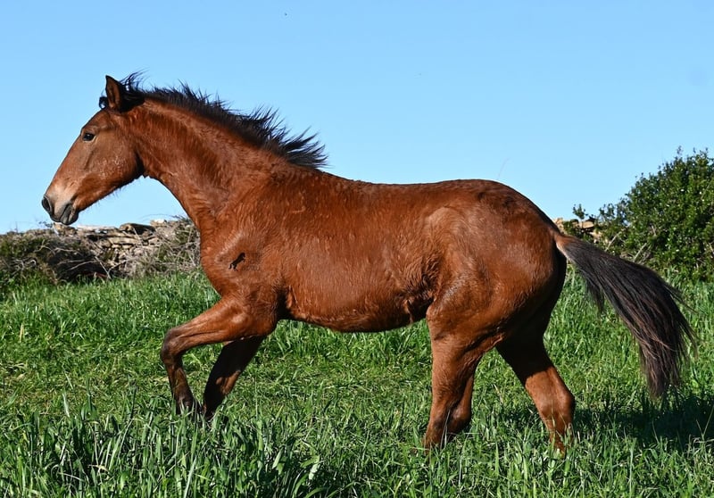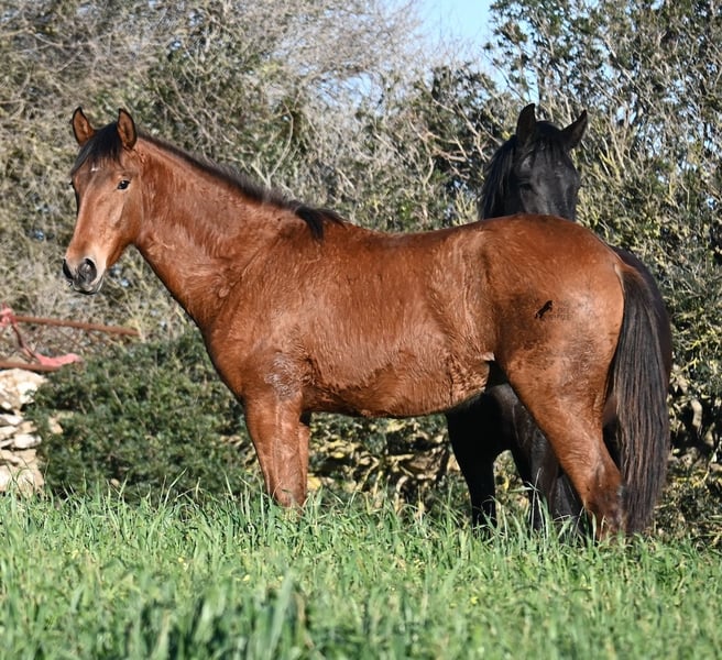 Dieser 03/2025 geborene Hengst, ist ein richtig robuster Rohdiamant! Sein Papa ist ein wunderschöner PRE x Menorquin Mix der mit seinen 22 Jahren noch topfit ist und eine eindrucksvolle Erscheinung. Sein 6jähriger Bruder ist 170cm groß und ein liebevoller, mutiger Charmeur. Seine 2 jährige Schwester (Bild) sieht mehr nach der Mutter aus, denn die ist eine reinrassige Menorquinstute, aus ganz alter Linie. Diese Mischung hat einen eleganten Youngster hervorgebracht, der den Mut und die Stärke von einem Menorquin mit sich bringt und das Exterieur mehr nach einem Spanier. Er darf auf über 40 Hektar Land, mit viel Steigungen und Felsen leben, was ihn durch die 24h Stunden Robusthaltung zu einem wirklich strapazierfähigem Pferd macht. Das sieht man auch an seiner Bemuskelung, den klaren Beinen und dem starken Rücken. Mama & Schwester sorgen für die Erziehung vom Jungspund, der ansonsten noch roh ist. Zum Absetzen war er in der Box und wurde halfterführig gemacht. Selbstverständlich wird er für den Transport wieder aufgefrischt ;) Sein zu erwartendes Endmaß wird um die 170cm liegen und durch seine tolle Bewegung wird er für viele Sparten interessant. Geländegängig ist er auf jeden Fall schon zu 100%, denn selbst der Geländewagen hatte Mühe, die steinigen Wege mit viel Steigung zu erklimmen, die der Bub mühelos und elegant bewältigt. Ein günstiger Nachwuchshengst mit Potenzial in vielen Sparten! Er hat einen Equidenpass und ist somit papiertechnisch auch reisefertig. Für all jene, die ihn erst später holen möchten, besteht die Möglichkeit auf einen Aufzuchtsplatz vor Ort. Videos und Abstammung gerne auf Anfrage. Sein Standort ist Menorca. Gerne organisiere ich vor Ort eine Fohlen-AKU,Transport oder auch ihre Reise, solltest du persönlich zum Anschauen kommen. Details dazu gerne auf meiner Seite oder im Gespräch. Saludos aus Spanien