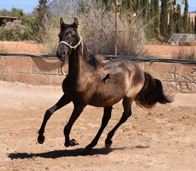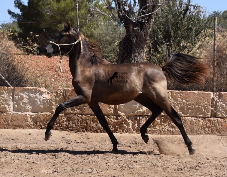 This PRE stallion (Andalusian with ANCCE breed certificate), born 04/2023, is still a little surprise in terms of color! He is registered by the ANCCE as a black stallion, but also shows signs of a dark dun. Since the color test was not done and he is the son of a Perlino, he will either be smoky black or a dark buckskin. In any case: beautiful! And for all those who don't want to be surprised, the color analysis can of course be ordered ;) The young man will not only surprise you with his color, but also with his movement! His long legs sweep across the arena and he really enjoys trotting. He is absolutely fearless and cool - which was a challenge to send him for good photos, but a great representation of his character. At some point you become a big, strong man, so you have to have the courageous character to match. He stands outside 24 hours a day in the company of other boys and is therefore well socialized and hardened. His pedigree, apart from the many special colors such as Perlino, dun and black, is also impressive. He can be traced back to the popular Mejorante stallion Remache XIII and Escalerablut can also be found in his genes. His expected final height is around 160cm. A very cool youngster with great qualities at a very fair price. His location is Mallorca. There is the possibility of leaving him with the breeder for longer. Videos and pedigree available on request. I would be happy to organize an AKU, transport or even your trip if you come to see him in person. Details can be found on my website or in conversation. Saludos from Spain