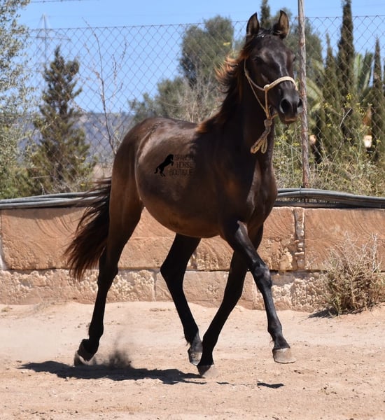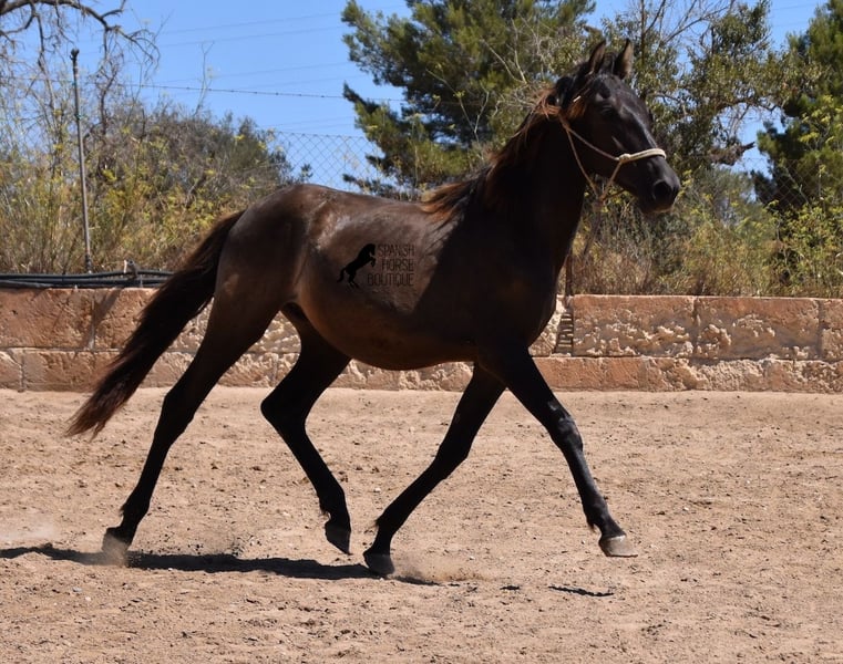 Questo stallone PRE nato ad aprile 2023 (Andaluso con certificato di razza ANCCE) è ancora una piccola sorpresa dal punto di vista del colore! È registrato come morello dall'ANCCE, ma mostra anche segni di essere un baio scuro. Poiché il test del colore non è stato effettuato e essendo figlio di un perlino, potrebbe essere uno smoky black o un baio scuro. In ogni caso: bellissimo! E per chi non vuole sorprese, è possibile richiedere un'analisi del colore ;) Il giovane sorprenderà non solo per il suo colore, ma anche per il suo movimento! Le sue lunghe gambe scivolano con grazia sul terreno e ama davvero trottare. È assolutamente impavido e tranquillo, il che ha reso difficile scattare buone foto, ma è una grande dimostrazione del suo carattere. Un giorno diventerà un uomo grande e forte, quindi deve avere un carattere coraggioso adeguato. Vive in condizioni rustiche, all'aperto 24 ore su 24 in compagnia di altri maschi, ed è quindi ben socializzato e temprato. La sua discendenza, oltre ai molti colori speciali come perlino, baio e morello, è di tutto rispetto. Discende dal popolare stallone Mejorante Remache XIII e ha anche sangue Escalera nei suoi geni. La sua altezza finale prevista è di circa 160 cm. Un giovane cavallo molto interessante, con grandi qualità a un prezzo molto equo. Si trova a Maiorca. È possibile lasciarlo più a lungo per l'allevamento presso l'allevatore. Video e genealogia disponibili su richiesta. Sono felice di organizzare in loco una visita veterinaria, il trasporto o anche il vostro viaggio, se desiderate venire a vederlo di persona. Dettagli disponibili sulla mia pagina o durante la conversazione. Saludos dalla Spagna.
