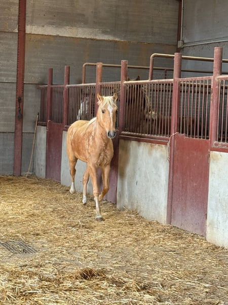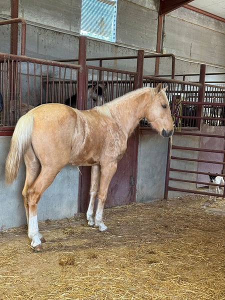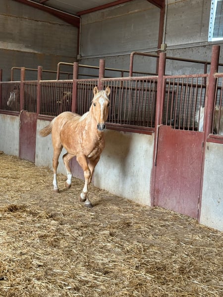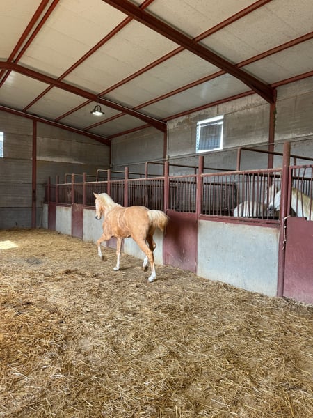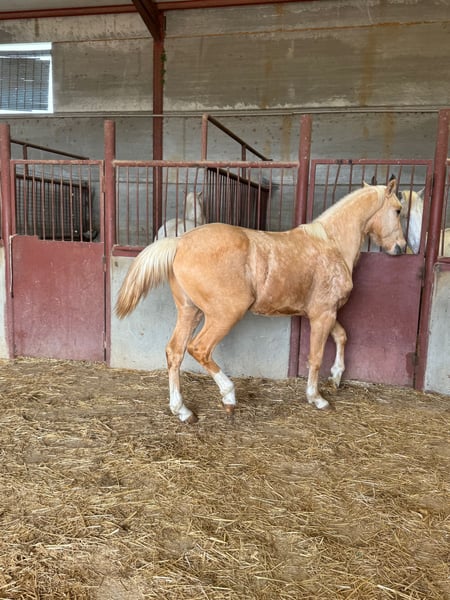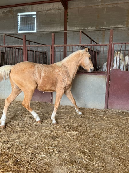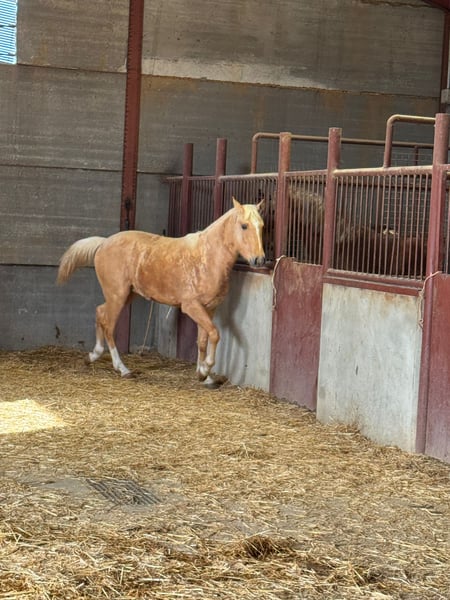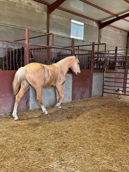 Potro palomino, de línea andaluza Movimientos correcto, excelente con su nobleza, recién traído del campo. Está críado en plena naturaleza. Ahora está viviendo sus primeras horas en un establo.