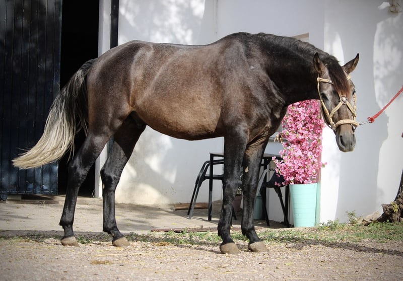 This handsome young gelding is ready to go: whether for dressage, leisure riding, or working equitation, EROS is up for any adventure. His sweet and trainable nature makes him a great companion in all situations. EROS is well-mannered and easy to get along with. He is still at the beginning of his training but already demonstrates that he aims to become a straightforward, reliable, and smooth-riding sport horse. EROS has been correctly and gently backed in all gaits and already rides well alone in the field. He is familiar with dogs and traffic and consistently remains very calm. He could also be castrated locally if desired. Spanish equine passport, free of melanomas. Located in Spain.