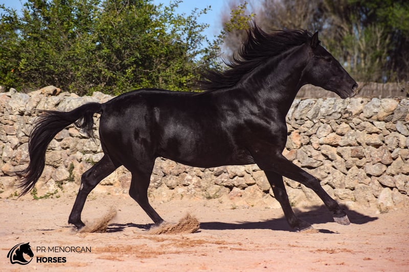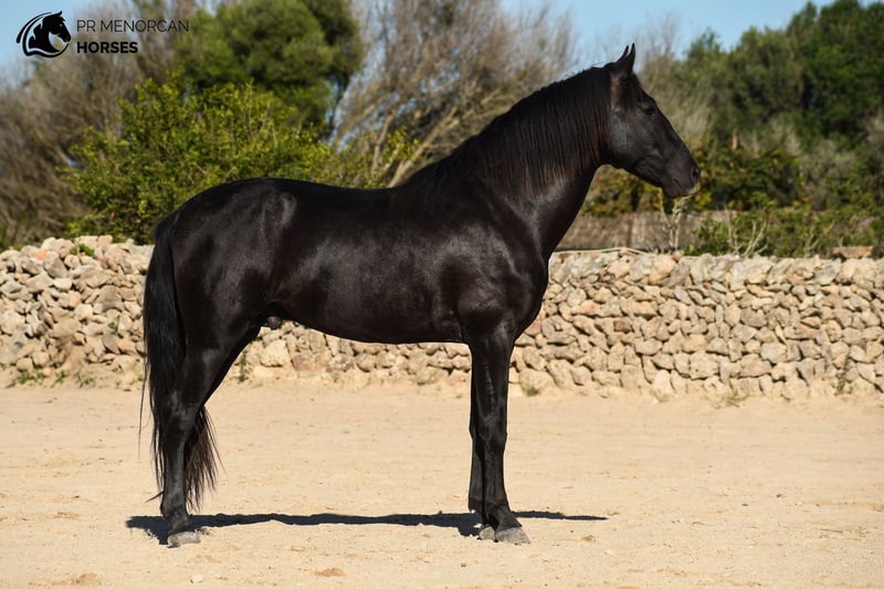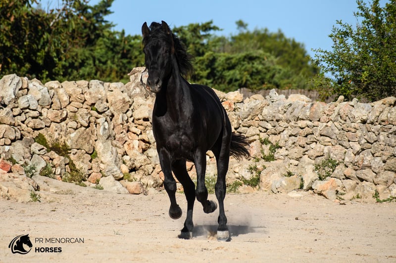 Unique opportunity! Stunning Andalusian stallion for sale, born in 2021. While he doesn't have a PRE passport (his mother didn't have one), he is the son of a majestic PRE stallion from the renowned Military Stud. With his sleek black coat and current height of 152 cm (he’ll continue growing until 6 years old), this horse is the perfect combination of beauty and potential. With the ideal balance of energy for work and a gentle, affectionate nature, he is perfect for those seeking a noble and close companion. He is calm under pressure and remarkably agile, making him the perfect partner for dressage, eventing, or working equitation. His calm demeanor also makes him ideal for relaxing trail rides. This remarkable horse is already familiar with basic handling: he picks up his feet easily, works beautifully on the lunge line, is accustomed to a bit and surcingle, and travels stress-free in a trailer. He behaves perfectly with the farrier and can live comfortably in both freedom or stabled environments. He is regularly dewormed and in excellent health. Location: Menorca You can visit him in person, or we can manage the entire purchase process online. We take care of the veterinary exam, paperwork, and transport – no matter where you are in the world! We can also help you organize castration before transport or training livery in Menorca. We’d love to help you find the horse of your dreams, and this may be the perfect partner you’ve been searching for!