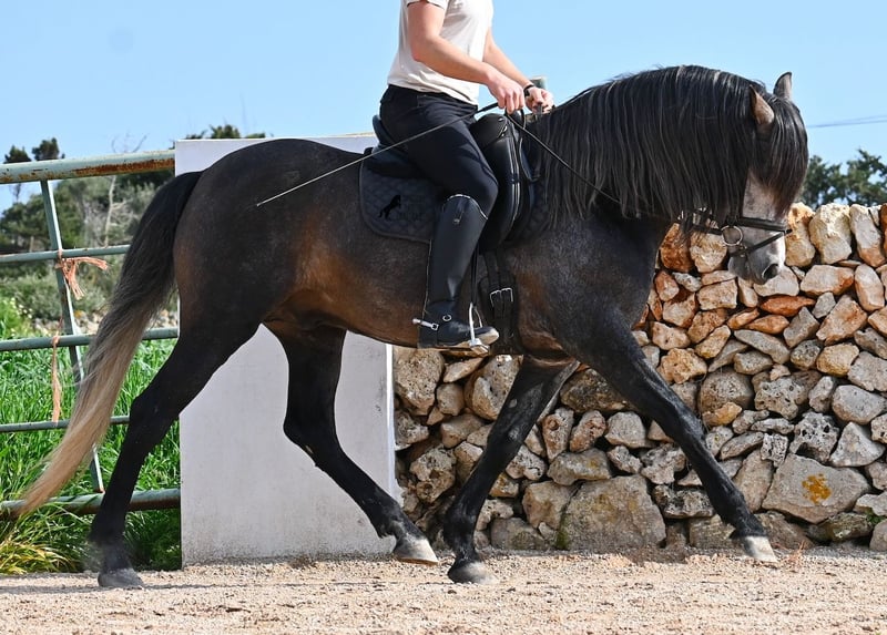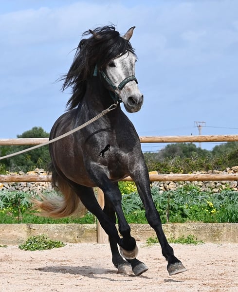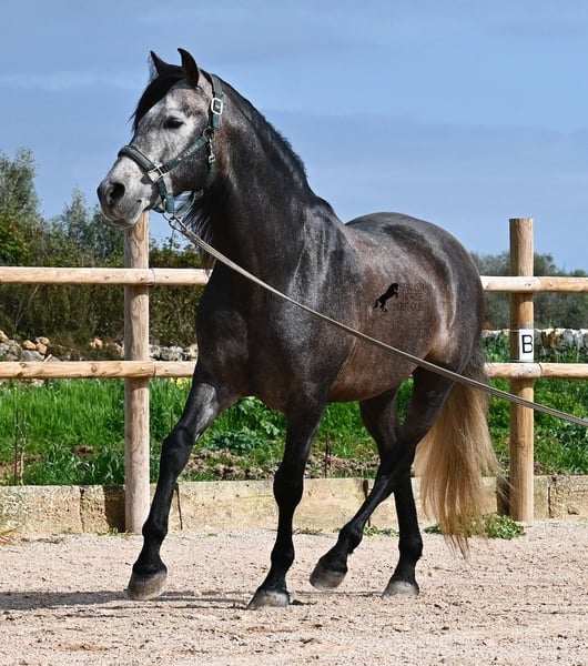 Este semental PRE de 2021, de raza pura (Andaluz con certificación de raza de la ANCCE), proviene de un criador muy amigo de los caballos. Hasta los 3,5 años, el joven pudo crecer completamente en estado salvaje en un grupo de sementales, simplemente siendo caballo y desarrollando excelentes contactos sociales. Ahora vive en un box grande con paddock, donde tiene como vecinos a sus compañeros con los que creció. Este tipo de crianza y cuidado se refleja en su carácter, ya que es absolutamente tranquilo, muy atento con las personas y, incluso si un pony le tira del rabo mientras lo cepillan, no mueve ni una oreja. Es un muchacho muy calmado y con una presencia serena, lo cual también se tiene en cuenta en su entrenamiento. Por ello, no se trabaja con prisa ni nerviosismo, sino que se le da tiempo; actualmente, su nivel de entrenamiento corresponde a un caballo de 4 años, pero esto es una ventaja, ya que se trabaja con suavidad (actualmente 3 veces por semana). Se realizan pausas frecuentes a la cuerda larga y él aprende cada vez mejor a estirarse, lo cual es muy bonito de ver. A pesar de terrenos pedregosos, camina sin problema descalzo incluso en campo y, de vez en cuando, prefiere cambiar el picadero por un hermoso paseo, lo que también le gusta mucho. Desde potro, ha sido muy robusto y su aspecto exterior refleja un estilo clásico, heredado de su linaje, que incluye MONIS, SA SINIA, CAMPO BAJO y YEGUADA MILITAR (Cartujano). Con una altura actual de aproximadamente 1,57 m, su tamaño es armónico con su físico compacto, pero ágil, lo que también lo hace interesante para disciplinas como la Working Equitation o el Western riding. Bajo la silla, siempre está atento al jinete y muy dispuesto. Ya mantiene bastante bien el contacto, aunque, por su edad, todavía necesita un poco más de equilibrio y impulsión desde atrás (como se mencionó, su entrenamiento no es apresurado, sino progresivo). Se monta con bocado de agua y ya se están iniciando trabajos laterales; además, posee una base sólida de entrenamiento. En el manejo, es un caballero, ya sea al colocarle las herraduras o al montar (se disponen videos). En mano, está aprendiendo el paso español y ha demostrado en parado lo bien que lo realiza y la belleza de su movimiento de hombro. Para quienes no puedan mantener un semental, existe la opción de castración en el lugar. Su tamaño final estimado será alrededor de 1,60 m, aunque su aspecto robusto hace que parezca más grande y cubre muy bien. Actualmente, su lugar de residencia es Menorca. Videos y pedigrí disponibles a solicitud. Con gusto puedo organizar una inspección veterinaria en el lugar, entrenamiento, castración, transporte o incluso su viaje, si desea venir a verlo en persona. Para más detalles, consulte mi página o hable conmigo. Saludos desde España