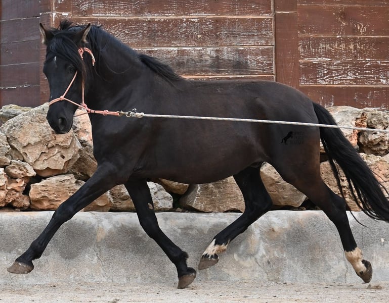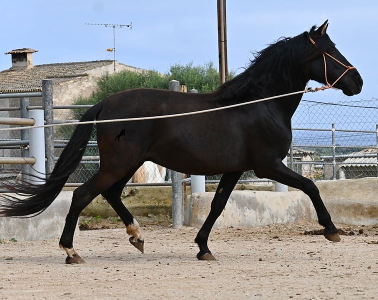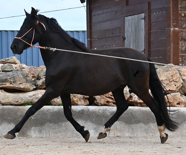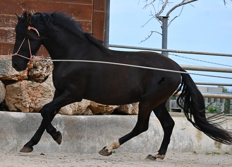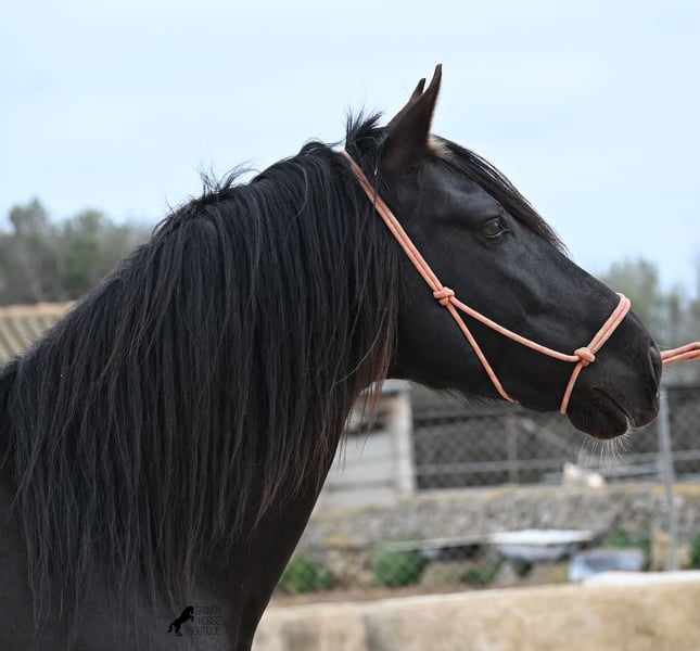 Few stallions have achieved as much success and fame as a Spanish dressage horse like POETA DE SUSAETA! He is also the sire of this impressive, baroque-looking colt, who has clearly inherited good movement as well. Born in summer 2021, this purebred Pura Raza Española stallion (Andalusian with ANCCE registration) also boasts an excellent pedigree on the dam’s side. His lineage includes the Mejorante stallion NERO II and the ELITE stallion Inedito, both renowned figures in the Spanish dressage world. Although his bloodlines are very sport-oriented, this young horse is nicely compact and baroque, which makes him even more special. His sleek black coat and gentle eyes complete the picture—what more could one wish for? He has not yet been backed, as the breeder prefers his horses to have time to grow and not be overburdened early on. This approach has paid off, as the stallion is extremely friendly, relaxed, affectionate, and overall a wonderful character. He is licensed and already has progeny; he lives a dream life—24/7 free turnout with his foal and dam! This is a very interesting opportunity for breeders, not only because of his pedigree but also due to his striking color. Perfect for those seeking an unspoiled horse partner with all doors open to leisure riding disciplines. Currently, he measures 159 cm and will likely grow a little more. He is barefoot, kept in a hardy environment, and there is the possibility of castration and/or training on-site. He is presently located in Mallorca! Videos and pedigree details are available upon request. A top-quality horse at a very fair price. I am happy to arrange on-site pre-purchase examinations, training, transport, or even your journey if you wish to view him personally. Please contact me for more details, either through my website or in conversation. Greetings from Spain!