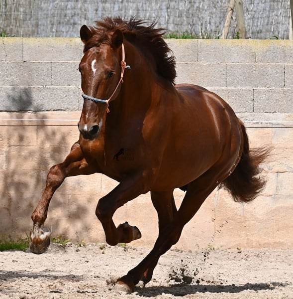 Dieser 2020 geborene PRE Hengst (Andalusier mit Rassenachweis der ANCCE), ist in vielen Aspekten, eine wahre Augenweide! Unumstritten fällt einem als Erstes seine atemberaubende Schöhnheit auf, die der Kupferstich in seinem Fell und der Esprit, nur so verstärken. Doch hinter der schönen Fassade, gibt es einiges mehr zu entdecken. Seine Abstammung ist superior, denn er ist ein Sohn des mehrfachen WELTCHAMPION Fer Bonachon de Eda und somit ein Enkel des berühmten Fer Bago. In seiner Abstammung finden wir nicht nur den Weltchampion und somit die FERRERO Linie, sondern auch Monis, Marin Garcia, Yeguada Militar, Guardiola und Bohorquez! Mütterlicherseits hat er Rappen, Füchse und Braune in der Abstammung, was ihn auch als Zuchthengst sehr interessant macht, da die meisten Bonachon-Kinder dem Vater als Schimmel gleichen und er diese TOP Linie vererbt, mit mehr Option auf farbige Nachzucht. Er ist gekört und hat bereits eine Nachzucht- ebenso ein Fuchs, was bestätigt, dass er farblich als Zuchthengst, nebst der Abstammung, mehr als interessant ist. Im Handling ist er ein absoluter Gentleman und obwohl er schon gedeckt hat, überhaupt nicht heiß oder hengstig. Sollte Hengsthaltung nicht möglich sein, bestände selbstverständlich die Option der Kastration vor Ort. Ambitionierte Reiter werden definitiv Spass an ihm haben, denn er lernt schnell und unter dem Reiter will er alles geben und taut so richtig auf. Auch unterm Sattel zeigt er absolut keine Unarten und ist unermüdlich. Wo andere PRE nach 15´sagen bitte fertig, taut er erst richtig auf und gibt alles. Seine Haltung ist auch ideal, was sich in seinem ausgeglichenen Wesen widerspiegelt. Er ist tagsüber frei auf dem Paddock, nachts zum Ruhen in der Box, wird 3x die Woche geritten und das meist im Gelände! Er ist im Gelände ein absolutes Verlasspferd und unerschrocken, egal ob alleine oder in Begleitung. Sei es Baumaschinen oder LKWs die an ihm vorbeirasen, er bleibt cool und marschiert weiter! Stundenlange Ausritte gefallen ihm auch gut, da kann er seine Ausdauer so richtig unter Beweis stellen. Am Platz ist er absolut fokussiert und beherrscht Seitengänge in allen Gangarten und hat schon genügend Gleichgewicht für große Runden im Außengalopp. An der Hand wird ihm gerade der spanische Schritt beigebracht. Ein wunderschöner, liebevoller und erzogener Hengst, mit viel Potenzial in diversen Sparten, der das Auge und das Herz erfreut! Preis der Qualität entsprechend. Sein aktuelles Stockmaß liegt bei 160cm. Aktuell steht er auf Mallorca! Videos und Abstammung gerne auf Anfrage. Gerne organisiere ich vor Ort eine AKU, Kastration, Beritt, Transport oder auch ihre Reise, sollten Sie persönlich zum Anschauen kommen. Details dazu gerne auf meiner Seite oder im Gespräch. Saludos aus Spanien