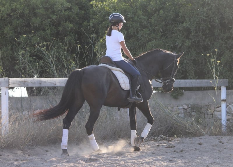 Diese schicke Lady in Black hat so einiges zu bieten: tolle Bewegungen, ein sportliches und elegantes Erscheinungsbild und dazu einen tollen, super ehrlichen und braven Charakter! Derzeit wird sie auch im gehobenen Reitunterricht mit jungen Reitschülerinnen eingesetzt und zeigt sich da absolut zuverlässig und leicht zu reiten. NIT - die Nachtschwarze - ist außerdem sehr Gelände erfahren und dort eine echte Lebensversicherung. Ein perfektes Pferd für Nachwuchsreiter oder Wiedereinsteiger mit Dressurambitionen. NIT ist korrekt in den GGA geritten und befindet sich derzeit im Profiberitt. Sie besitzt einen spanischen Pass ohne Abstammungsnachweis. Standort Spanien.