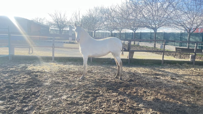 Perlino Pura Raza Española merrie uit de bloedlijn van Paco Martí. Ze is anderhalf jaar oud, barok in type, met een ramkop, sterke botstructuur en goede bewegingen. Ze zal een toekomstige fokmerrie worden, met veel lichaamsmassa en capaciteit om bijzondere nakomelingen te produceren. Geïnteresseerden voor meer informatie of om een bezoek te regelen, worden verzocht het in de advertentie vermelde nummer te bellen. Dank u wel. #perlino, #cremello, #roomkleurig, #verdund, #PRE, #albino, #fokkerij
