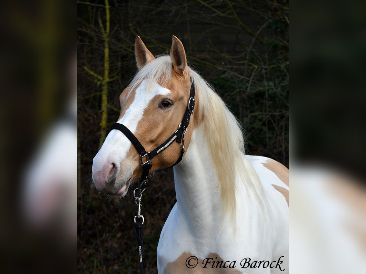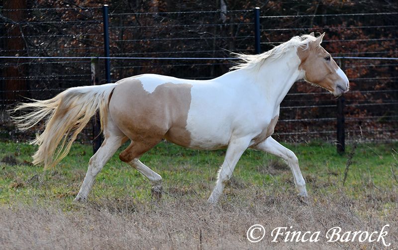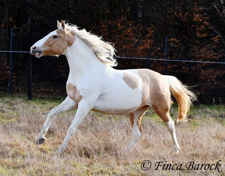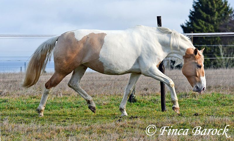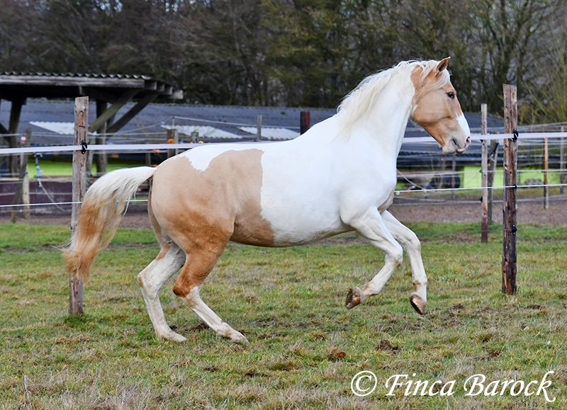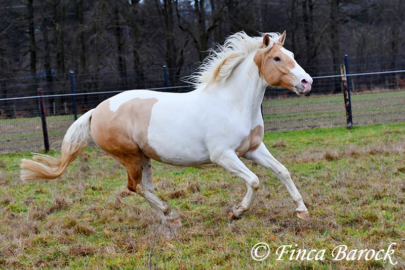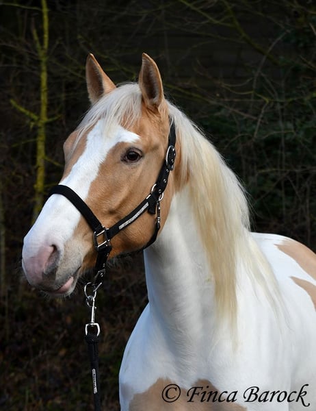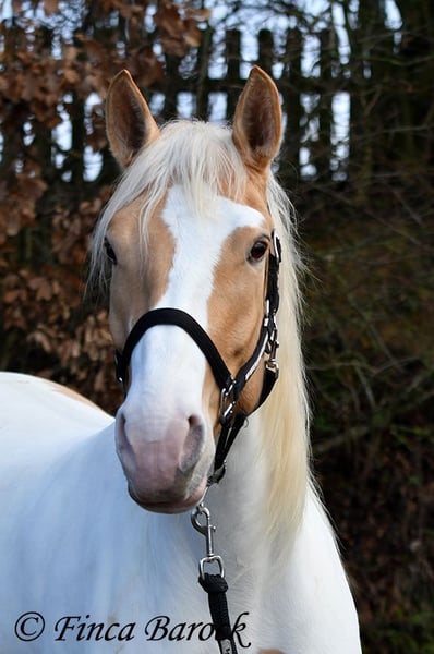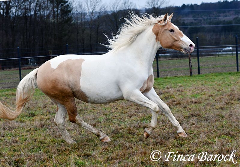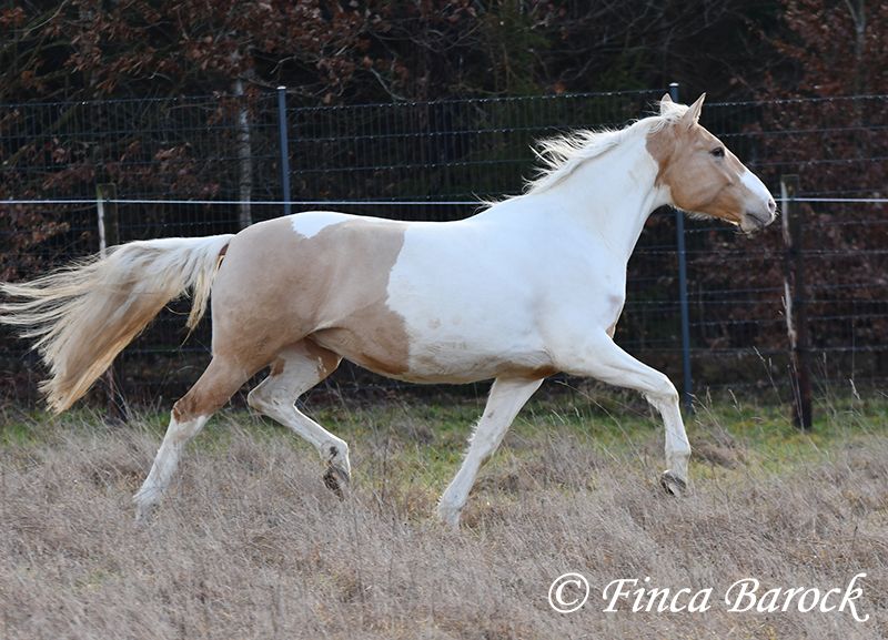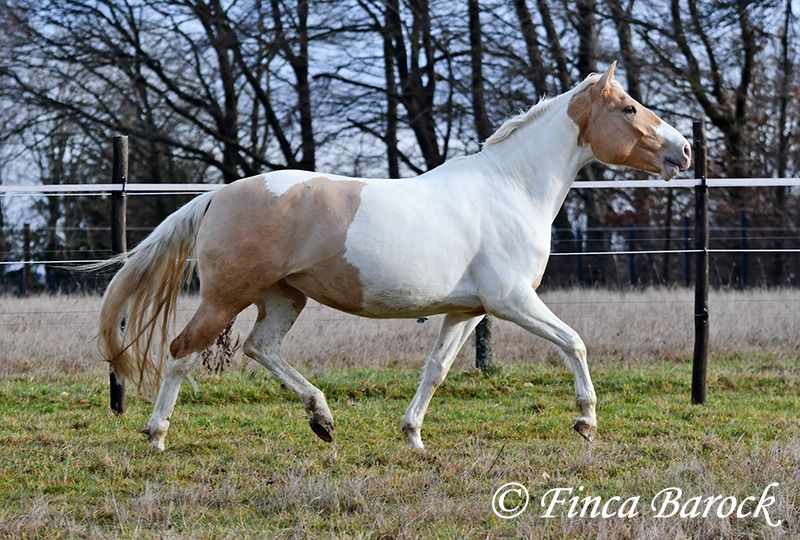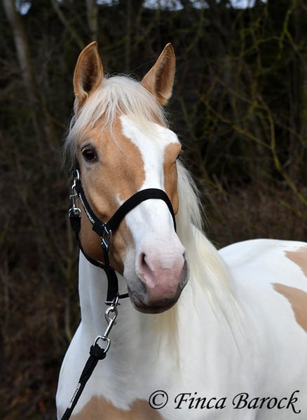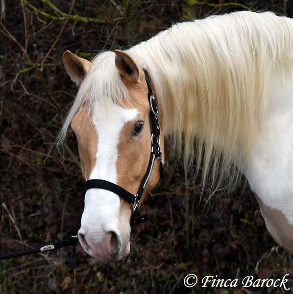 Race : Andalusian mix Name : Lokah Samastha Sexe : Jument Taille au garrot : environ 1,61 m Date de naissance : 04/02/2022 Couleur : Pie Prix : 8 500 € Père : inconnu Mère : Andalouse Lokah, est une jument robuste au pelage exceptionnel. Sa robe pie attire immédiatement l’attention. Elle est arrivée bébé, enceinte de sa mère, chez sa propriétaire. Elle a été élevée avec tendresse et a eu le temps de mûrir. Lokah est avec nous depuis trois mois pour son dressage et connaît désormais la marche en avant sous la selle. Elle est câline et curieuse. Progressivement, elle a fait la connaissance du cavalier. Sous la selle, elle se montre exemplaire. À pied, Lokah peut parfois remettre en question ses tâches (en gros : « Je suis là, c’est ennuyeux, pourquoi ne pas avancer de deux mètres ? »). Mais avec clarté et cohérence, elle comprend vite ses exercices et coopère volontiers. Elle a très bien réussi sa première sortie en extérieur à cheval. Elle est habituée à la vie en troupeau et connaît l’herbe. Une jeune, compacte demoiselle, encore au début de sa formation, avec toutes les portes ouvertes. Son cadre compact lui permet également de porter des cavaliers plus grands avec aisance. Vidéo en liberté : https://youtu.be/XLSbKj85pq0?si=bCTgMNRNhYripONt Contact : Finca Barock, tél. 0173-696 31 81, 56291 Wiebelsheim