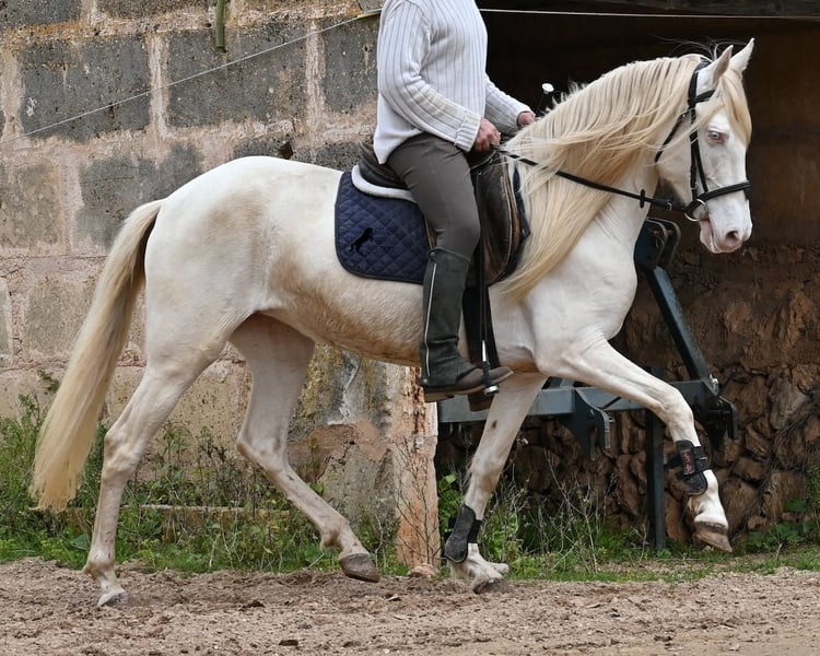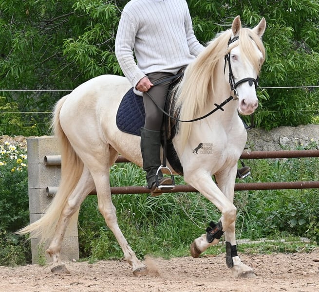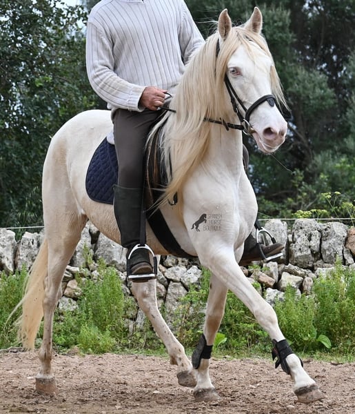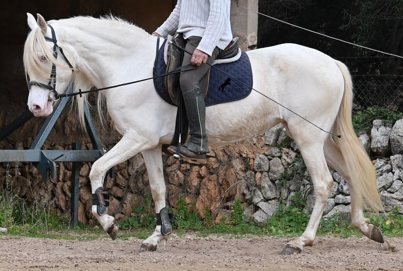 Diese 2020 geborene Andalusierstute (PRE Eltern, sie hat einen Equidenpass) ist ein wahres Juwel. Ihr traumhaftes Aussehen mit den stechend blauen Augen und der langen Mähne, zusammen mit ihrem femininen Exterieur, machen sie zu einer wahren Augenweide. Doch sie ist so viel mehr, als nur schön! Seit Dezember 2019 ist sie erst unter dem Sattel und stand bis dahin wie ein Wildpferd in der Stutenherde. Diese lange Zeit, die sie hatte um einfach ein soziales Pferd zu sein, hat sie auch im Kopf reifen lassen. Denn sie lernt unfassbar schnell und hat sich in kürzester Zeit sehr an ihren Reiter gebunden. Mit nur 153cm Stockmaß ist sie nur leider zu klein für ihn, um für immer zu bleiben. So wird für sie ein Zuhause gesucht, wo man so mit ihr umgeht, wie sie es gewohnt ist- mit viel Liebe, Zuwendung und schonendem Training. Sie wurde schön an der Longe bemuskelt, bevor es unter den Reiter ging, das sieht man besonders an der tollen Halsung, die auch mit dem Gewicht der langen Mähne, stark ist und nicht zur Seite neigt. Es werden ihr immer wieder Momente am langen Zügel angeboten und nichts wird mit hast gemacht. Am Reitplatz war sie keine 5x unterm Reiter, es geht immer ins Gelände, inklusive Baden im Meer und bis zu 3h unterwegs, wo sie einfach unermüdlich ist! Unfassbar ist, wie extrem mutig und unerschrocken sie ist. Ich habe sogar ein Video, wo eine riesige Baumaschine an ihr vorbeifährt und sie stolziert unerschrocken vorbei, als wäre nichts! Radfahrer und Autos von vorne und von hinten- sie marschiert! Und das auch mit Energie, denn sie hat viel Tatendrang und man muss sie an die Ruhe erinnern, denn sie will einfach vorwärts. Wobei sie immer sanft ist, selbst wenn man im Galopp die Zügel komplett loslässt. Für Geländereiter ist sie jetzt schon eine ideale Partnerin, wenn man ein wunderschönes Pferd im Sonderlook mit großem Herzen und unermüdlicher Lust zu marschieren sucht. Für alle die auch gerne im Viereck unterwegs sind, müsste sie noch etwas mehr in der Biegung und Anlehnung gearbeitet werden, aber mit ihrem Charakter, wird sie auch das schnell lernen. Die Zähne wurden vor Kurzem gemacht, sie geht vorne beschlagen und hinten barhuf und ihren Alltag verbringt sie im Offenstall mit anderen Stuten. Ein fabelhaftes Pferd mit viel Potenzial zu einem mehr als fairen Preis! Videos und Abstammung gerne auf Anfrage. Ihr Standort ist Mallorca. Gerne organisiere ich vor Ort eine AKU, Transport oder auch ihre Reise, sollten Sie persönlich zum Anschauen kommen. Details dazu gerne auf meiner Seite oder im Gespräch. Saludos aus Spanien