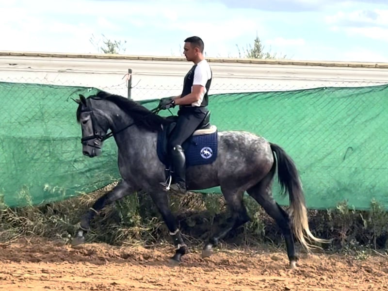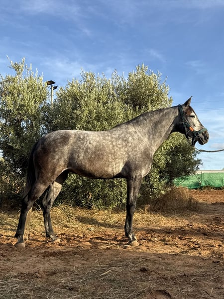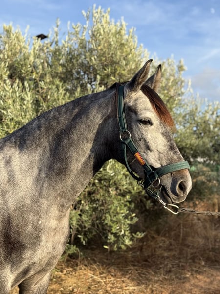 Amalia, mare born 2019 and ap. 158 cm. She's a cross between a Lusitano mare and Oldenburg stallion but without pedigree in her passport. Amalia is a beautiful mare with a lot of charisma and a sweet mentality. Amalia has very good movements with a lot of elasticity and cadence. She's very fun to ride and it feels like she has a lot of potential to reach the higher levels. She's comfortable to sit on and has a nice mouth with a soft contact. Amalia is well educated, does all lateral exercises, flying changes and started playing with piaffe and passage. She's easy to handle and also nice to go hacking with. Older X-rays are available. Amalia is located in southern Spain and we help with all the steps in the buying process. Read more about us at www.cthorsesales.com Contact: info@cthorsesales.com