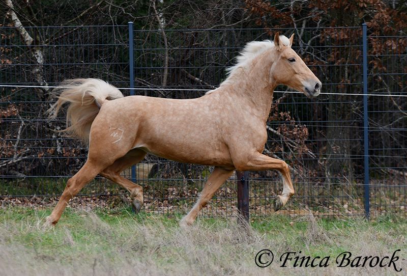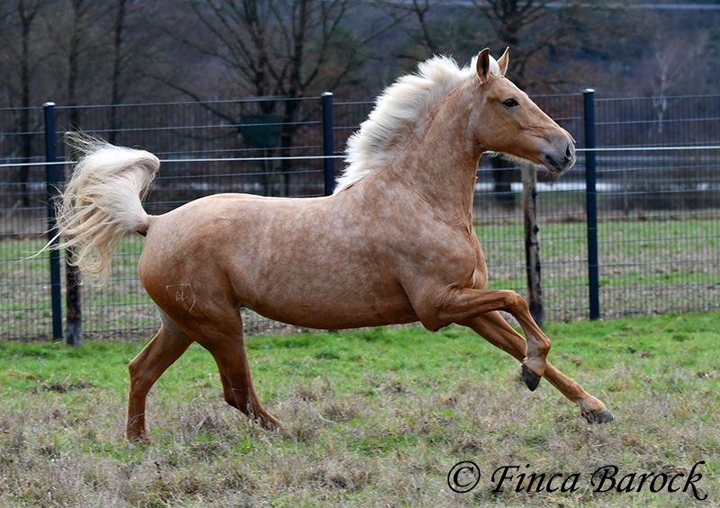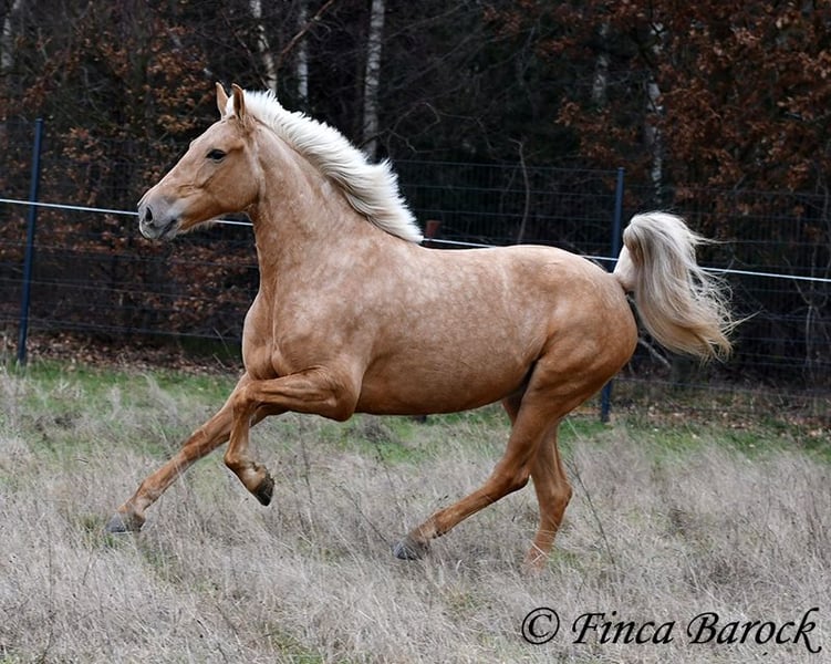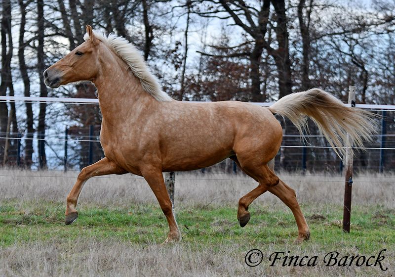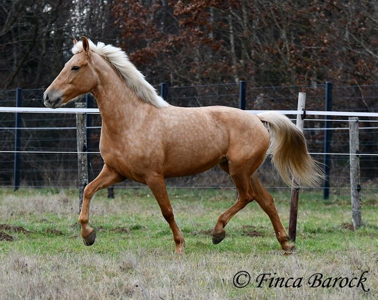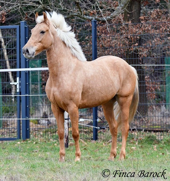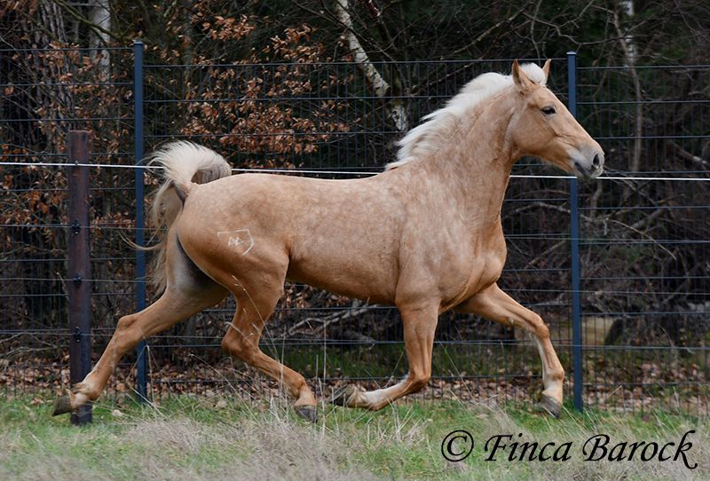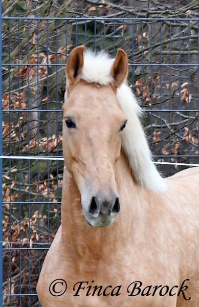 Breed: Andalusian Name: Nadadora Gender: Mare Height: 16.1 hh Date of Birth: February 1, 2019 Color: Palomino Price: €7,999 Sire: Unknown Dam: Unknown Nadadora is a very attractive, compact mare with an excellent size. Her striking jet-black eyes make her a real eye-catcher. She has mostly been ridden in the terrain and feels very at home there. Nadadora is accustomed to exploring both alone and in a group, often encountering dogs, traffic, and water without issue. She is less experienced with work in the dressage arena. In this environment, she can be somewhat unsure and tends to either move forward diligently or stop, depending on the aids she receives. She is never mean and can always be regulated. However, she still finds it challenging to walk a calm trot. The more she gets to know the rider and their aids, the better she becomes. With us, she is gradually learning to work in the dressage arena and is steadily becoming more confident and routine. We are looking for a person who enjoys extensive trail riding and ground work, as Nadadora is very receptive and eager to participate in both. She has smooth, flowing movements and can comfortably carry larger riders. A friendly, large mare with extensive trail riding experience, who, with proper training, will develop a lot of enjoyment in the dressage arena as well. Contact: Finca Barock, Tel. 0173-696 31 81, 56291 Wiebelsheim