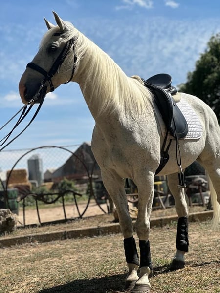 Amaranto Cheval 3 sangles luso-anglo-arabe, lusitanien 50%, anglais 25%, arabe 25%. Hauteur au garrot mesurée avec un hypomètre 1,60 m Né en avril 2009 Gris pommelé Castré Idéal pour le champ et la piste A participé à de nombreux événements de tout type. Très bien dressé. Bons mouvements et très confortable. Cessions à la jambe, épaules en dedans, travers, renvers, appuyés, galops alternés, initié aux changements de pied... Pour toute question, appelez le 696613777.