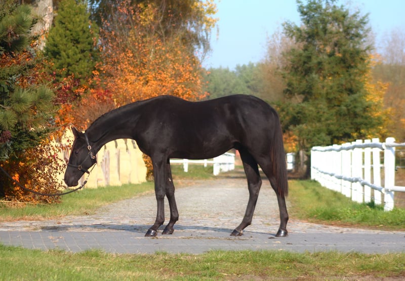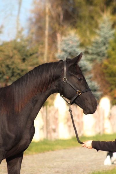 For sale 1,5 yo lovely stallion in BLACK HOMOZYGOUS color (DNA tested) He is by Emark - amazing black dressage polish stallion, compete in high level. (last picture) Also many more best Anglo Arabian horses such as Jalienny , Efekt, Veritas etc...in the pedigree, suitable for dressage, eventing or breeding ! Grandsire The Anglo Arab stallion All That Jazz was imported to Biddesden from Victoria in Australia as a colt. His sire is the Arab stallion SS City Lights who was bred in the USA and nearly 16 hands. His dam is Belingo, an Australian Thoroughbred by Saulingo. Jazz was always a tall colt with great scope to his stride. He has the softest and springiest of canters as all who have been lucky enough to ride him will attest. He was taken through the ranks to advanced level in British Eventing by William Fox-Pitt and went hunting for a season with the South and West Wilts. His foals have been successful in the show ring and have made a promising start in eventing, with their big strides and elegant steady head positions. Also australian, both arabian and thouroughbred horses are well known and appreciated for their hardness and durability and have achieved many successes in international endurance ! LORENZO AA is Of exceptional beauty , long-legged and well built, with elastic and extensive movement. Long neck, beautiful subtle head. He is now 164/5 cm high at 1, 5 yo cm, and final estimate height about 173/5 cm !!! Born and raised on big meadows, pastured every day with a group of youngsters. he has exceptional fantastic character, absolutely people oriented, very friendlty and calm. Full papers, e-passport, vaccinated, dewormed etc. He will be sold ONLY TO A BEST HOME ! Located western Poland near PL/D border . Transportation can be arranged . Contact by WhatsApp + 48 513 179 245