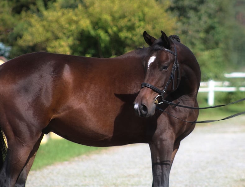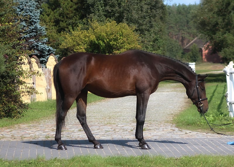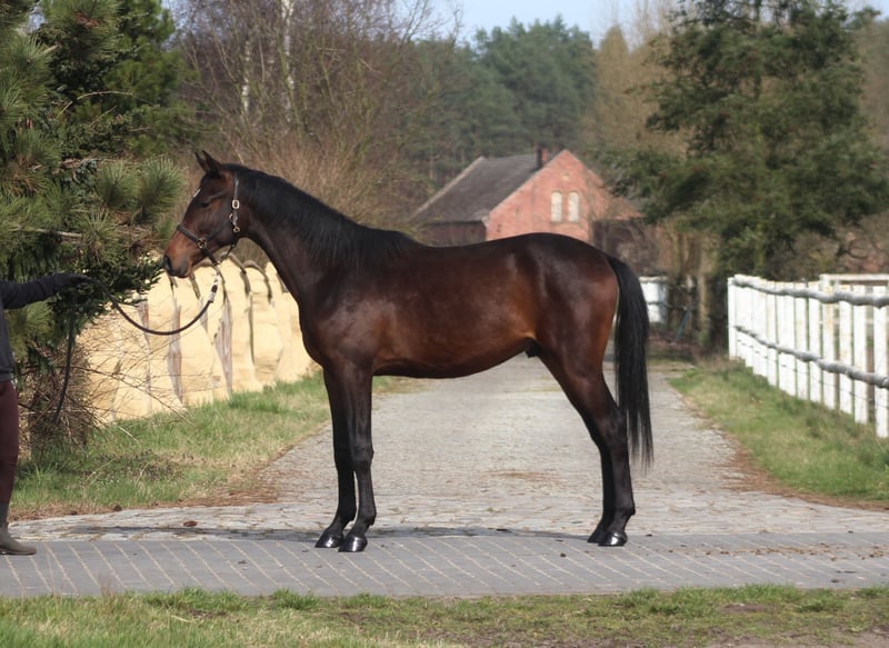 For sale: 3-year-old beautiful gelding by Emark - an amazing black dressage Polish stallion, competing at a high level (last picture). Also, many more top Anglo-Arabian horses in the pedigree, suitable for dressage, eventing, or endurance. Grandsire: The Anglo-Arab stallion All That Jazz was imported to Biddesden from Victoria in Australia as a colt. His sire is the Arabian stallion SS City Lights, who was bred in the USA and stands nearly 16 hands. His dam is Belingo, an Australian Thoroughbred by Saulingo. Jazz was always a tall colt with great scope to his stride. He has the softest and springiest of canters, as all who have been lucky enough to ride him will attest. He was taken through the ranks to advanced level in British Eventing by William Fox-Pitt and went hunting for a season with the South and West Wilts. His foals have been successful in the show ring and have made a promising start in eventing, with their big strides and elegant, steady head positions. Also, Australian Arabian and Thoroughbred horses are well-known and appreciated for their hardness and durability and have achieved many successes in international endurance! Empire AA is of exceptional beauty and charisma, long-legged and well-built, with elastic and extensive movement. Long neck, beautiful subtle head. Very good topline. He is now 166 cm high at 3 years old, with a final estimated height of about 168/169 cm. Lovely chocolate color! Born and raised on large meadows, pastured every day with a group of youngsters. Candidate for dressage, eventing, or endurance sport (nearly 50% Arabian blood) for a tall rider! His dam is an endurance horse in Estonia, and his granddam was exported to Dubai, competing in 120 km races. The price will increase with the level of training. Full papers, e-pass, vaccinated, dewormed, etc. Located in western Poland near the PL/D border. Transport can be arranged. Contact via WhatsApp +48 513 179 245.