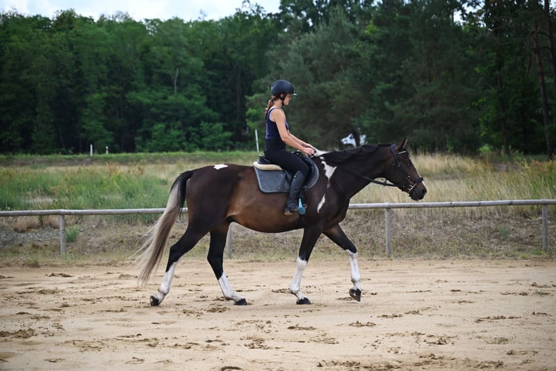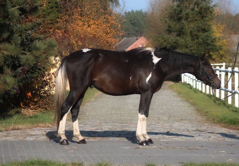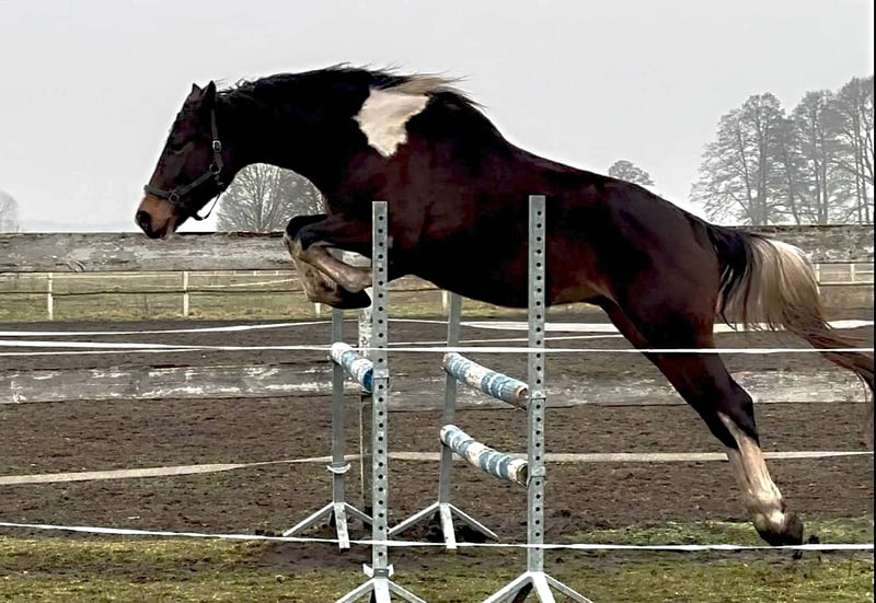For sale 4-yo piebald lovely gelding. Tall, frame-like, correctly built on strong straight legs and strong deep hooves. Beautifully colored piebald in a chocolate shade. Very calm pro-human character. Brave, easy-going and calm in handling and under saddle. He is not electric or excitable, a wise thinking horse, willing to cooperate with people. Initially broken in last autumn, without rushing or patents. He went out into the fields. Currently temporarily not much further trainig due to the winter weather. The horse shows great jumping predispositions and very good technique. Good movement, gallops very nicely. Great jumping pedigree from polish angloarab horses: Father Jaśmin: Extremely handsome, correct in build, endowed with very good movement and jumping technique. The horse characterized by good health, balanced temperament is the Vice-Champion tests in 2010, which he passed with a top results. The horse became the Vice-Champion and gold medalist of national championship in 2011. Jaśmin comes from the very distinguished female line of the mare Śmigła, from which such horses as: Jard: IV place at the German Eventing Championships 2022, Jaskinia: II place polish champoship C class 2004, Jamajka: IV place polish championship C class 2008. Grandpa Frazes (Level 150 cm) An Anglo-Arabian stallion bred and own by State Stud. As a young horse, this very good jumper was subjected to sports training both in eventing and show jumping. In 2003, he won the title of Polish Champion of Young Eventing Horses in the four-year-old category. In 2004 he came 12th (out of 66 competing horses) at the Polish Young Horses Jumping Championships in the five-year-old category, making only one mistake during the three days of competition. In 2006 he came 5th at the Polish Championships in jumping in the seven-year-old category. He successfully competed in jumping in the years 2007-2009. Frazes's offspring presented themselves positively at the National Youth Championships of Małopolska(angloarab) Horses in Białka and (older generations) at the Training Plant. Two daughters from the first youth generation by Frazes received a very good mark and took the two top places in the performance tests in 2009. In the same year, Frazes' son, Dionizos, won the stallion performance test at Bogusławice with excellent marks, and a year later Jaśmin came second, also receiving a very good mark. In 2010 Frazes went on a few months' lease to France. Further in the pedigree we have the outstanding stallion Arcus xx (level 160 cm) stallions Sebastian (140 cm) , Paszkwil, Agrest ... A very future horse for sports in a beautiful unusual color. Current height 166 cm, target approx. 168/9 cm Healthy, run, well-groomed, fed with high quality feed, daily on the paddock with a group of friends. Located in 50 km from PL/D border. Transport can be arranged. More on whatsApp + 48 513 179 245