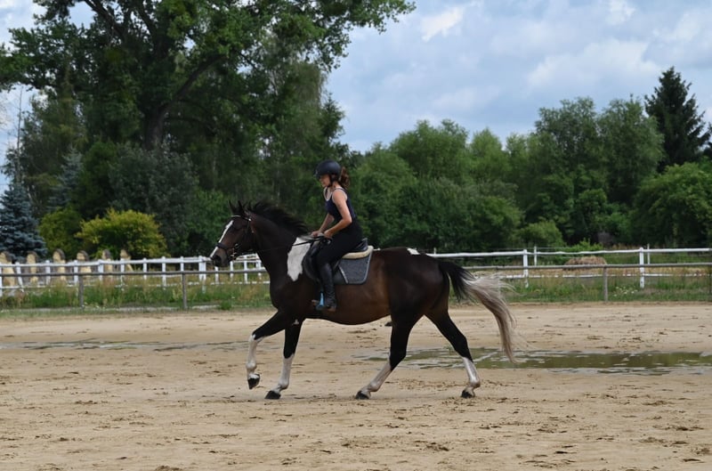 For sale 4, 5-yo piebald lovely gelding. Tall, frame-like, correctly built on strong straight legs and strong deep hooves. Beautifully colored piebald in a chocolate shade. Very calm pro-human character. Brave, easy-going and calm in handling and under saddle. He is not electric or excitable, a wise thinking horse, willing to cooperate with people. Initially broken in last autumn, without rushing or patents. Works in the arena and in the land. Very easy and nice to ride, in the and very brave and not spooky. Safe in traffic, dogs, cars etc. He did his first 2 -days trail and did perfectly !! The horse shows great jumping predispositions and very good technique. Good movement, gallops very nicely. Currently 168 cm, final ca. 169/170 cm Great jumping pedigree from polish angloarab horses: Father Jaśmin: Extremely handsome, correct in build, endowed with very good movement and jumping technique. The horse characterized by good health, balanced temperament is the Vice-Champion tests in 2010, which he passed with a top results. The horse became the Vice-Champion and gold medalist of national championship in 2011. Jaśmin comes from the very distinguished female line of the mare Śmigła, from which such horses as: Jard: IV place at the German Eventing Championships 2022, Jaskinia: II place polish champoship C class 2004, Jamajka: IV place polish championship C class 2008. Grandpa Frazes (Level 150 cm) An Anglo-Arabian stallion bred and own by State Stud. As a young horse, this very good jumper was subjected to sports training both in eventing and show jumping. In 2003, he won the title of Polish Champion of Young Eventing Horses in the four-year-old category. In 2004 he came 12th (out of 66 competing horses) at the Polish Young Horses Jumping Championships in the five-year-old category, making only one mistake during the three days of competition. In 2006 he came 5th at the Polish Championships in jumping in the seven-year-old category. He successfully competed in jumping in the years 2007-2009. Frazes's offspring presented themselves positively at the National Youth Championships of Małopolska(angloarab) Horses in Białka and (older generations) at the Training Plant. Two daughters from the first youth generation by Frazes received a very good mark and took the two top places in the performance tests in 2009. In the same year, Frazes' son, Dionizos, won the stallion performance test at Bogusławice with excellent marks, and a year later Jaśmin came second, also receiving a very good mark. In 2010 Frazes went on a few months' lease to France. Further in the pedigree we have the outstanding stallion Arcus xx (level 160 cm) stallions Sebastian (140 cm) , Paszkwil, Agrest ... A very future horse for sports in a beautiful unusual color. Free jumping easily 145 cm , under the rider 80 cm so far due to his young age . Healthy, run, well-groomed, fed with high quality feed, daily on the paddock with a group of friends. Proce + 8% VAT We have more nice and quality Malopolska horses for sale . Located in 50 km from PL/D border. Transport can be arranged. More on whatsApp + 48 513 179 245