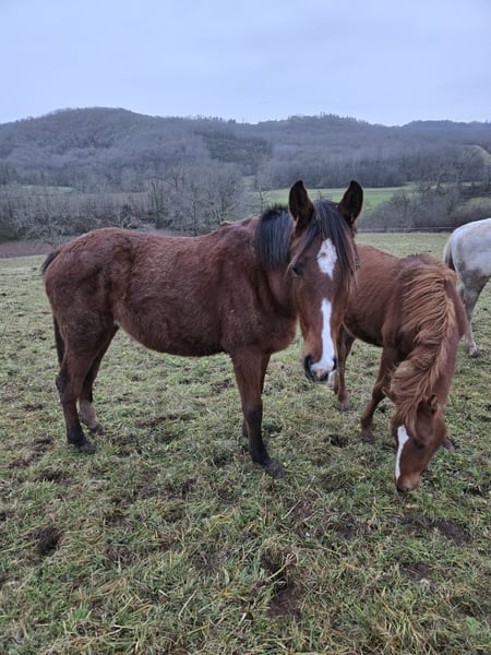 Jument anglo arabe née en avril 2024 prendra 2 ans cette année. Très grande pouliche très bien faite typée sport et bien éduquée (tiens a l'attache, transport, pansage, douche etc) Elle est très gentille très câlins. Elle fera le bonheur de sa future famille. Toise estimée à 165cm minimum. Maréchal à jour. Vermifuges. Elle vie en troupeau avec des copains de son âge pour un parfait équilibre. Super papier : Côté mère Enka d’ai : - No comment chayottes ISO 126 - Gral des vernieres ISO 138 - Dum’pom ISO 132 - Korrigan du Gevaudan ISO 154 - Belo des vernieres ISO 137 Et côté père Elfe de pompadour ISO 116: - Upsilon ICC 165 - Fusain ISO 162 - Véloce de favi ISO 156 - Encore une médaille ICC 147 Et j'en passe ... ! Superbe jument d'avenir dans le concours ou même l'élevage au vue de son pedigree. Pouliche calme et attachante très grande et bien faite beaucoup de chic et se déplace bien ! Elle est a venir rencontrer aux écuries de Léon. Transport possible dans toute la France.