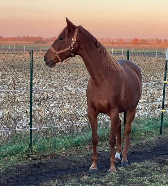 Esta bonita yegua (aproximadamente 1,63 m) destaca por su excelente conformación, su presencia y su carácter sincero. Proviene del exitoso semental Anglo-Árabe Magistral y posee movimientos básicos muy buenos: con paso claro, trotando con ritmo y un galope potente. Está entrenada de acuerdo a su edad (conoce la silla, la brida, el trabajo en longe, el salto en libertad), aunque aún no ha sido montada. Es sensible, aprende con facilidad y se deja manejar muy bien con calma y firmeza. Una vez que confía en su jinete, quiere agradar y participa en todo con entusiasmo. Debido a que, por las renovaciones en nuestra casa, ha quedado un poco descuidada, deseo para ella un hogar amoroso donde pueda ser estimulada y ocupada. Venta privada. Si está interesado en serio, estaré encantado de recibir un mensaje.