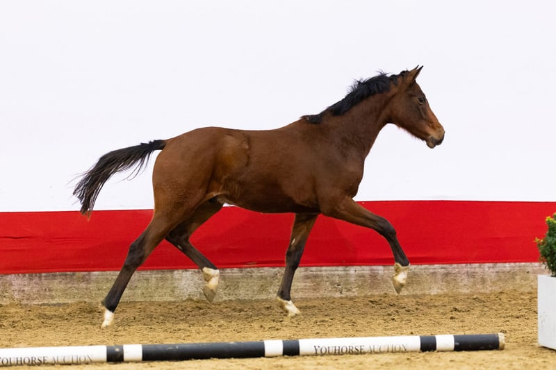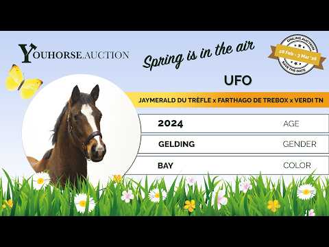 Light-footed young horse with engine and power Hazelberg’s UFO will only turn two and is making his first jumps here. His attitude is clearly present. He is light off the ground, shows good push off the fence and a strong natural engine. In movement, his very good hind-end stands out: the hind leg is well placed underneath the body and he canters clearly uphill, which translates directly into power over the jump. A well-balanced, strong and attractive model with strength and future potential.