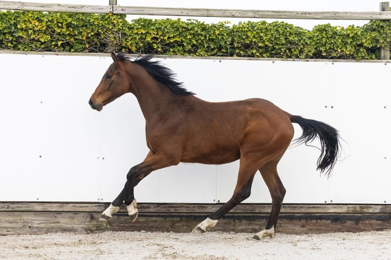 Light-footed young horse with engine and power Hazelberg’s UFO will only turn two and is making his first jumps here. His attitude is clearly present. He is light off the ground, shows good push off the fence and a strong natural engine. In movement, his very good hind-end stands out: the hind leg is well placed underneath the body and he canters clearly uphill, which translates directly into power over the jump. A well-balanced, strong and attractive model with strength and future potential. Sire Jaymerald du Trèfle (Emerald van ’t Ruytershof x Girly du Trèfle) is KWPN licensed and competing at 1.35m level. Through Emerald van ’t Ruytershof (1.60m, BWP Ambassador) he brings reflexes, blood and scope, combined with the proven sport influence of Kannan GFE in the damline. A modern sire line focused on technique, power and attitude. Damline The dam is Hazelberg’s Kiterunner (Farthago de Trebox), descending from a proven performance family. Farthago de Trebox competed at 1.40m level and is known for passing on scope and attitude. The second dam Evercor (Verdi TN) carries top-level sport genetics. Verdi TN competed at 1.70m Grand Prix level and is one of the most influential sires of his generation. The third dam Petite Fleur (Corrado I) produced several sport horses, including: – Lennox (Lancer II), 1.30m – Campeon (Corrado I), 1.35m Further back we find Hurricane (Landgraf I) and Moncherie S (Contender), anchoring the family with generations of international sport and proven performance. A damline with depth, durability and results at 1.30m level and higher. For horses younger than 24 months, it is not mandatory with us to take X-rays. At this age, horses are still in full development and their joints are not yet fully matured. If any abnormalities are suspected during the clinical examination, this will be noted in the clinical report and/or additional X-rays will be taken for further investigation. This horse was previously auctioned, but as the buyer did not meet his obligations, the payment was never completed. The horse itself is exactly as described. Perhaps it’s no coincidence the previous buyer didn’t pay — this horse was simply meant for you!