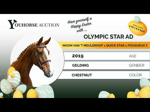 Olympic Star is een modern sportpaard met veel bloed, een lichtvoetige galop en een zeer goede instelling. Hij is voorzichtig, heeft veel reflex op de sprong en laat een fijne manier zien. Hij laat zich prettig rijden en geeft de ruiter een goed gevoel. Een paard met veel kwaliteit, dat alles met veel gemak doet en een natuurlijke aanleg heeft om op hoger niveau te presteren. Hij heeft zijn kwaliteiten al bewezen bij de zevenjarigen en heeft dit jaar al een 1.40m parcours gelopen. Een paard met veel vermogen en een groot hart, dat alles aanpakt wat je hem voorzet. Door zijn bloed en kwaliteit zien wij hem het best tot zijn recht komen bij een professionele ruiter. Vader Nixon van ’t Meulenhof springt op 1.60m Grand Prix niveau en behoort tot de moderne tophengsten. Hij geeft vermogen, techniek en reflexen door en bracht al meerdere internationale springpaarden. Moeder Une Star de Bacon sprong op 1.30m niveau en is een dochter van Quick Star (1.60m). De moederlijn is zeer sterk en brengt meerdere internationale springpaarden: Sam de Bacon (1.60m) Gypsy de Bacon (1.60m) Exquise du Pachis (1.60m) Chic Hin d’Hyrencourt (1.60m) Tyson AZ (1.60m) Tara de Bacon (1.55m) Noah de Bacon (1.55m) Romany (1.50m) Vendetta de la Roque (1.50m) Panthère de Bacon (1.50m) Unique d’Hyrencourt (1.55m) meerdere paarden op 1.40m–1.45m niveau Een stam met uitzonderlijke prestaties op het hoogste niveau.