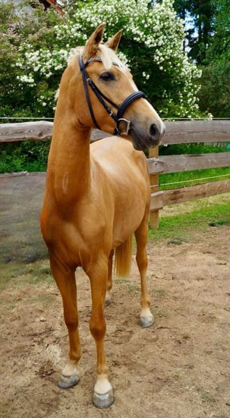 ⚜️Milano Gold – Palominohengst mit besonderer Ausstrahlung⚜️ Mit Milano Gold präsentieren wir einen jungen Hengst, der nicht nur durch seine seltene Sonderfarbe Palomino, sondern auch durch seine Veranlagung und sein Wesen begeistert. Milano Gold ist ein dreijähriger Hengst (geb. 2022), aktuell ca. 1,55 m groß und befindet sich weiterhin sichtbar im Wachstum. Sein kompakter, sportlicher Körperbau und seine harmonischen Proportionen lassen bereits jetzt auf eine vielversprechende Entwicklung schließen. ⚜️Seltene Farbe mit genetischem Potenzial⚜️ Milano Gold trägt das begehrte Cremgen, das für die charakteristische Aufhellung sorgt – und das nicht nur optisch: Er vererbt dieses Gen mit einer Wahrscheinlichkeit von 50 %, was ihn besonders für Züchter interessant macht, die auf Sonderfarben setzen. ⚜️Erfolgreiche Körung – Talent am Sprung⚜️ Im September 2025 absolvierte Milano Gold seine Körung mit einem sehr guten Ergebnis. Besonders im Freispringenkonnte er die Richter mit viel Übersicht, Technik und Vermögen überzeugen. Seine Springanlage zeigt sich kraftvoll, klar strukturiert und mit natürlicher Intelligenz – eine ideale Grundlage für den Sport. ⚜️Top-Abstammung – doppelte Veranlagung⚜️ Milano Gold ist nicht nur optisch ein Highlight – seine Genetik spricht für sich. Er stammt väterlicherseits vom Michelangelo A der wiederum vom bekannten Magic Memphis ab, dem er sowohl die Sonderfarbe als auch Ausdruck und Präsenz verdankt. Über die Mutterseite bringt er erstklassige Springgene von Chaman und Ismo mit. Diese Kombination macht ihn doppelt veranlagt – mit besten Voraussetzungen für Rittigkeit, Springvermögen und sportliche Leistung. ⚜️Charakter zum Verlieben⚜️ Milano Gold überzeugt nicht nur unter dem Sattel oder an der Hand, sondern auch im täglichen Umgang: Ausgeglichen, menschenbezogen und unkompliziert zeigt er sich als absolut umgänglicher Partner – ein Charakter, der sowohl Profis als auch ambitionierte Amateure begeistert. Milano Gold steht ab sofort für alle Stuten (alle Farben) zur Verfügung. Decktaxensplittung: 200€ + 300€ bei Trächtigkeit. Bei Interesse an Deckeinsätzen oder weiteren Informationen freuen wir uns über Ihre Kontaktaufnahme!