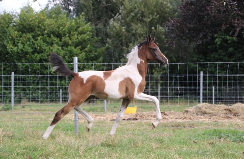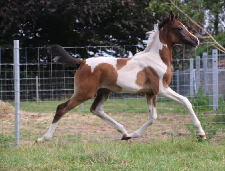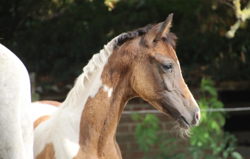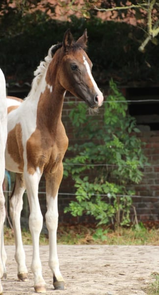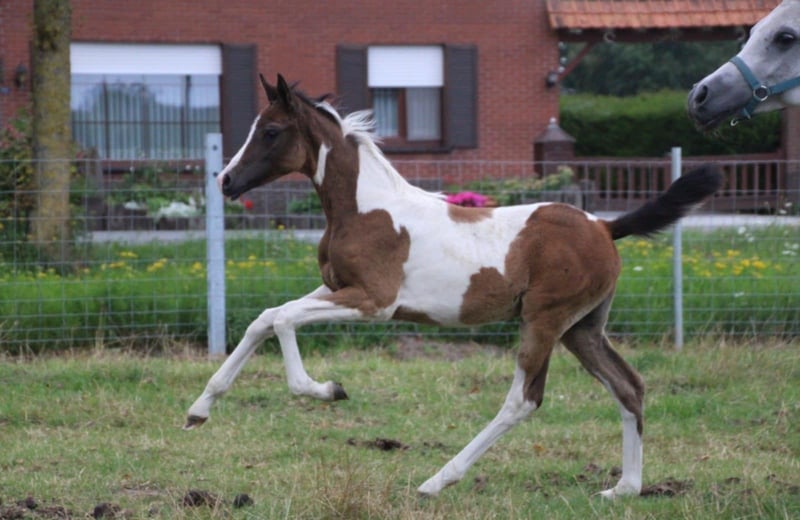 Beautiful filly Her sire is the recently deceased all-round stallion Reddy Wally Ter Linden (BWP) by Eddy Wally, who achieved impressive results in jumping and eventing. Her dam is FL Mir Amira (Arabian purebred), daughter of Profender K.A. (multi-international champion, including three-time Belgian Champion). Her full brother and son compete in endurance events over 80 km. We believe these lines could produce a sporty, versatile, and people-oriented horse with good stamina. Both parents have excellent temperaments. The dam stands at 1.60 m, and the sire at 1.62 m. Wadira is registered with AES. We would love to keep following her development. She is already allowed to leave her mother. She has a sweet temperament, is social, and walks nicely on a lead.
