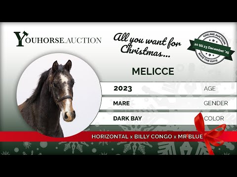 Melicce is a compact, modern mare with blood and quick reflexes. She jumps lightly and sharply, showing an attractive technique with sufficient scope. She moves with good body use and displays a willing attitude, making her very appealing as a future sporthorse. A young mare with expression and potential. Her sire Horizontal, by Casall, is only eight years old but already competes successfully at 1.45m level. He stands out for his mentality, scope and the quality he passes on to his offspring. Her dam is also being sold in this auction, giving a clear view of this proven family. Granddam Elicce has produced two horses jumping 1.40m and higher, and further in the damline several horses competed at 1.40m and above — a reliable performance pedigree. Melicce comes from one of Germany’s largest and most reputable sporthorse breeders. She is completely unbroken and knows nothing more than a halter. Having lived exclusively in the field, she has had plenty of time to grow correctly and develop strength in her body and legs. An honest and pure mare now ready to begin her training. With her type, jumping style and strong damline, Melicce offers excellent future potential — both for sport and for breeding.
