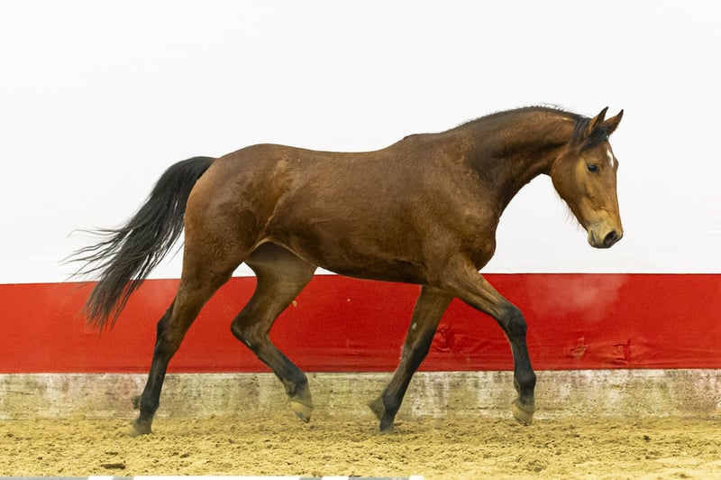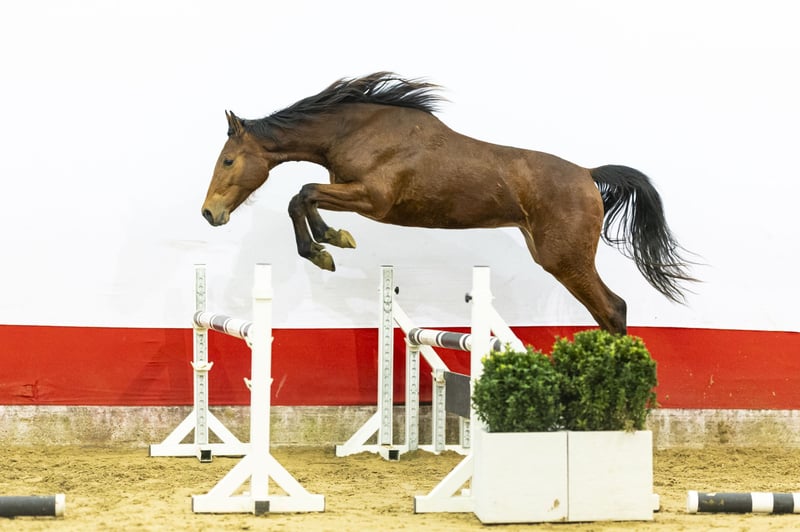 A very interesting horse with plenty of blood, light-footedness and a big heart. She shows great commitment over the fence and possesses an excellent hind leg technique. In her first jumps she already demonstrates natural scope and instinct. She is still green in everything and has not been handled extensively yet. Nevertheless, she moves easily with a strong engine from behind to in front. Her canter is balanced and gives a very pleasant, light feeling. A modern horse with quality that will develop into technically correct jumping.