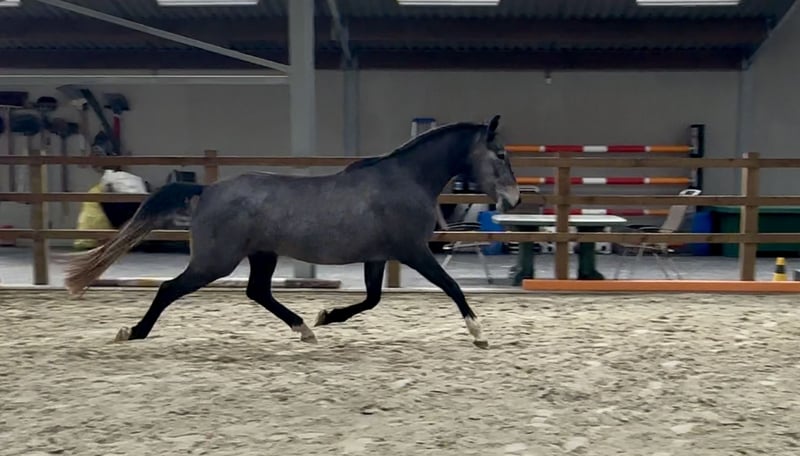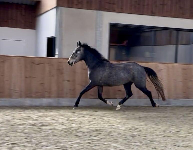 Tochter einer physisch starken Lipizzaner-Stute mit großzügigen Bewegungen und dem robusten Lusitano-Hengst Trovador Raposa (Dressur GP und Working Equitation). Aufgewachsen in einer familiären Umgebung in einem natürlichen Umfeld und schrittweise stressfrei abgesetzt. Täglich erhielt sie einen Balancer als Grundfutter. Die Hufe wurden von Anfang an regelmäßig gepflegt. Sie genoss die Grundarbeit am Boden, beherrscht das Trailerladen und konnte regelmäßig eine bereichernde Umgebung sowie passive Physiotherapie genießen. Sie verfügt über ein gutes Gleichgewicht und kraftvolle Bewegungen. Geeignet für Dressur, Freizeit, Working Equitation. Kurz gesagt, ein vielversprechender Start für die passende Person. Video auf Anfrage (und auf der Facebook-Seite von Stal Caroline De Lannoy zu finden): https://www.facebook.com/reel/1349062933694877